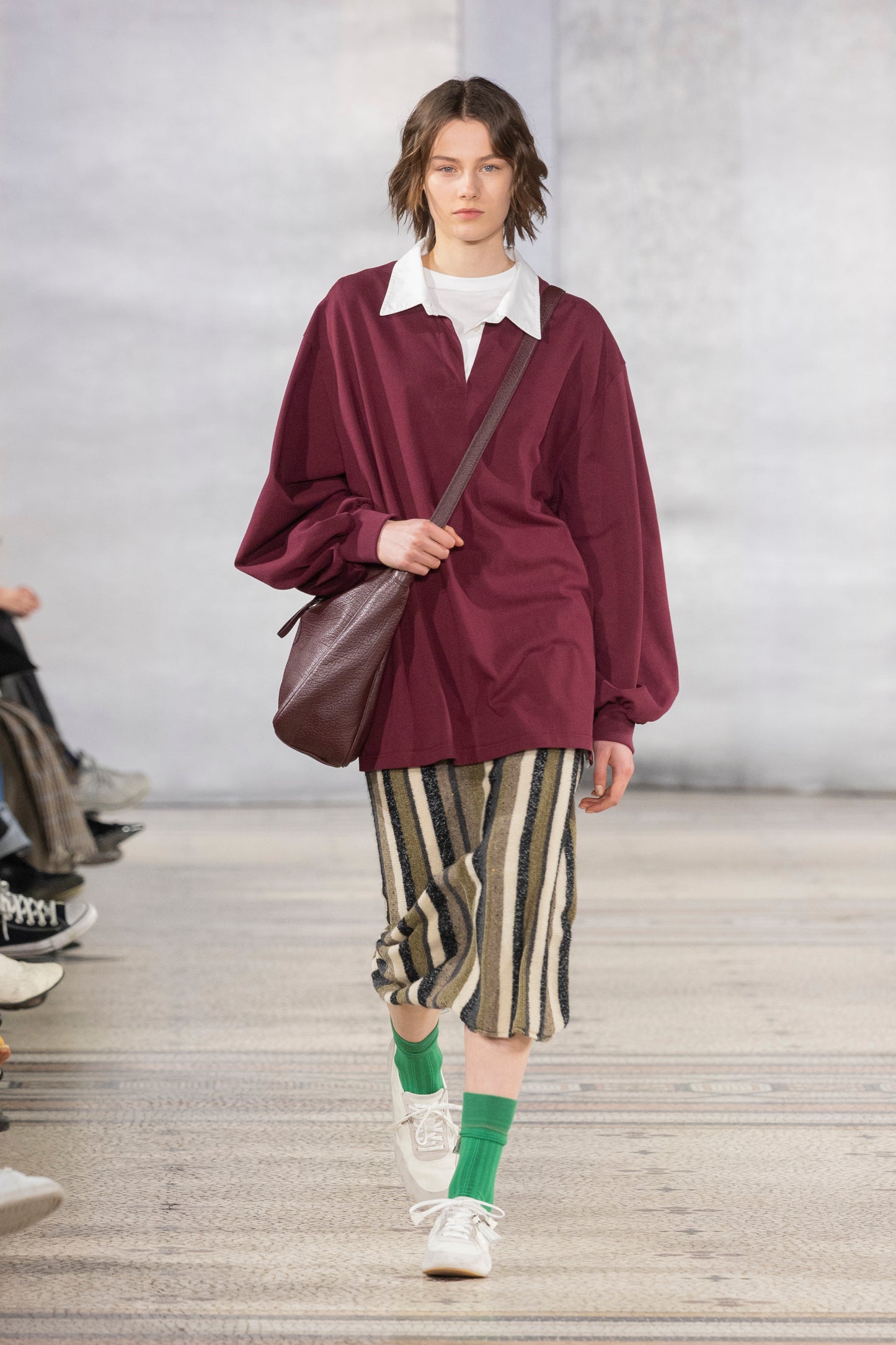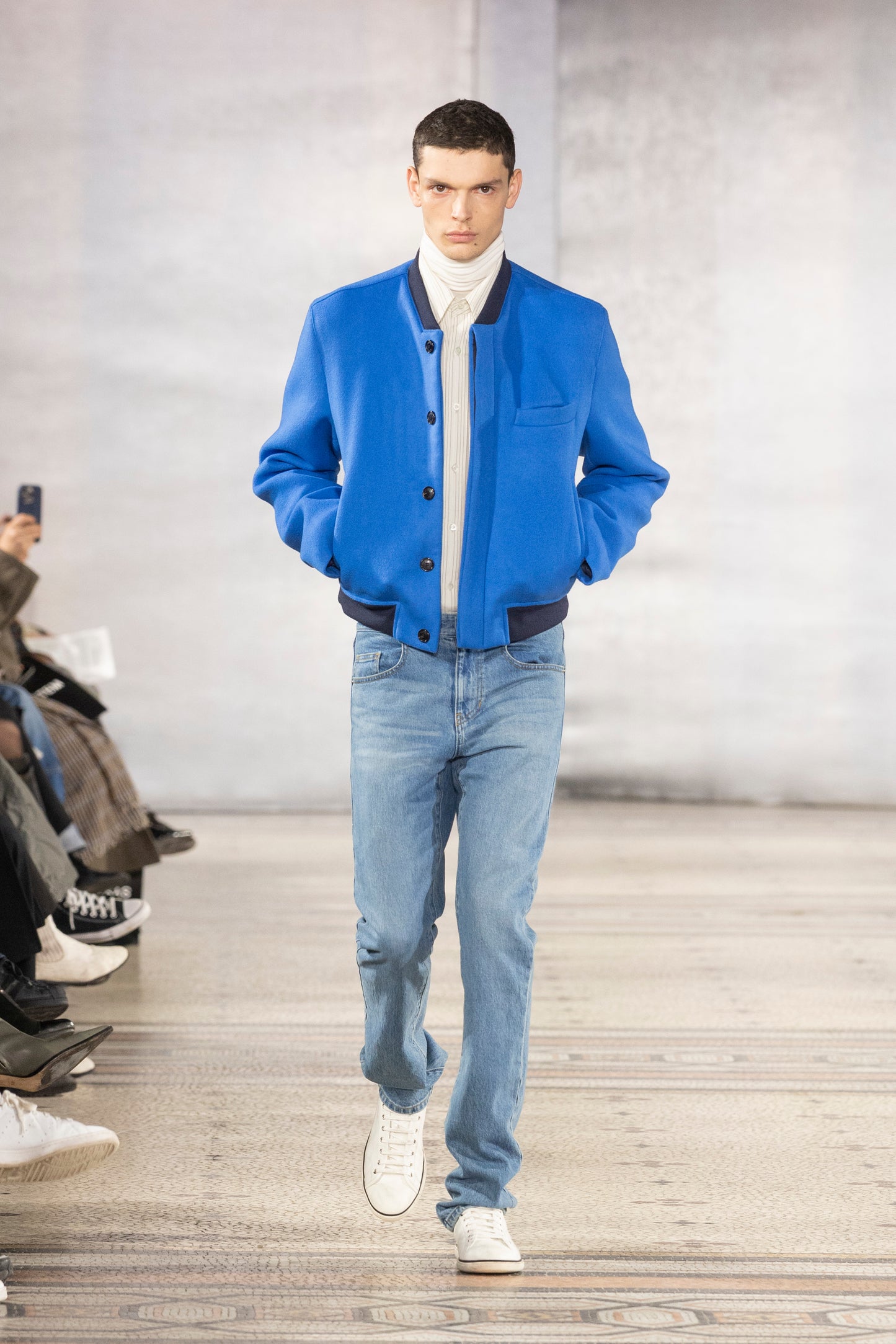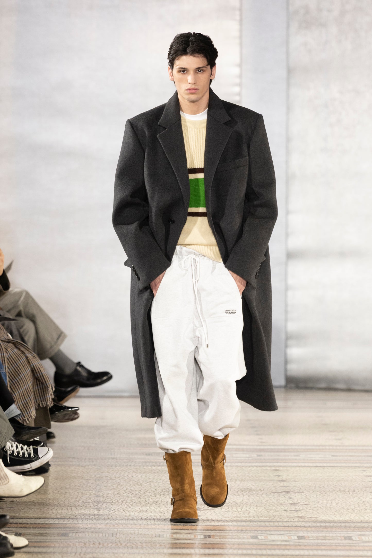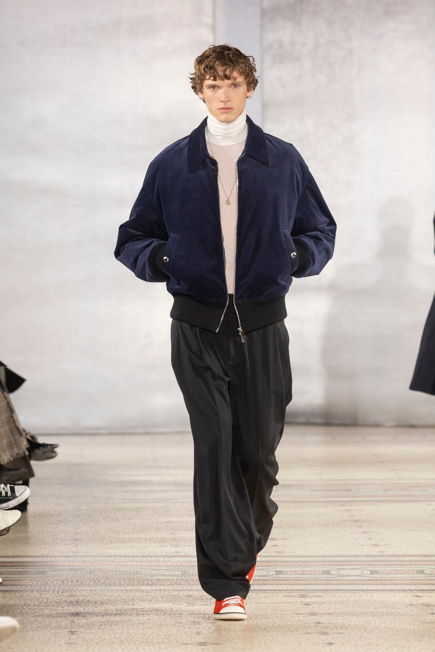Materials and color further reinforce this narrative. Sued, corduroy, and washed velvet create powdery and tactile surfaces, while soft jersey and subtly lustrous leather introduce a contemporary street sensibility. A predominantly neutral palette is punctuated by vivid red and blue accents, infusing the collection with bold energy and individuality.