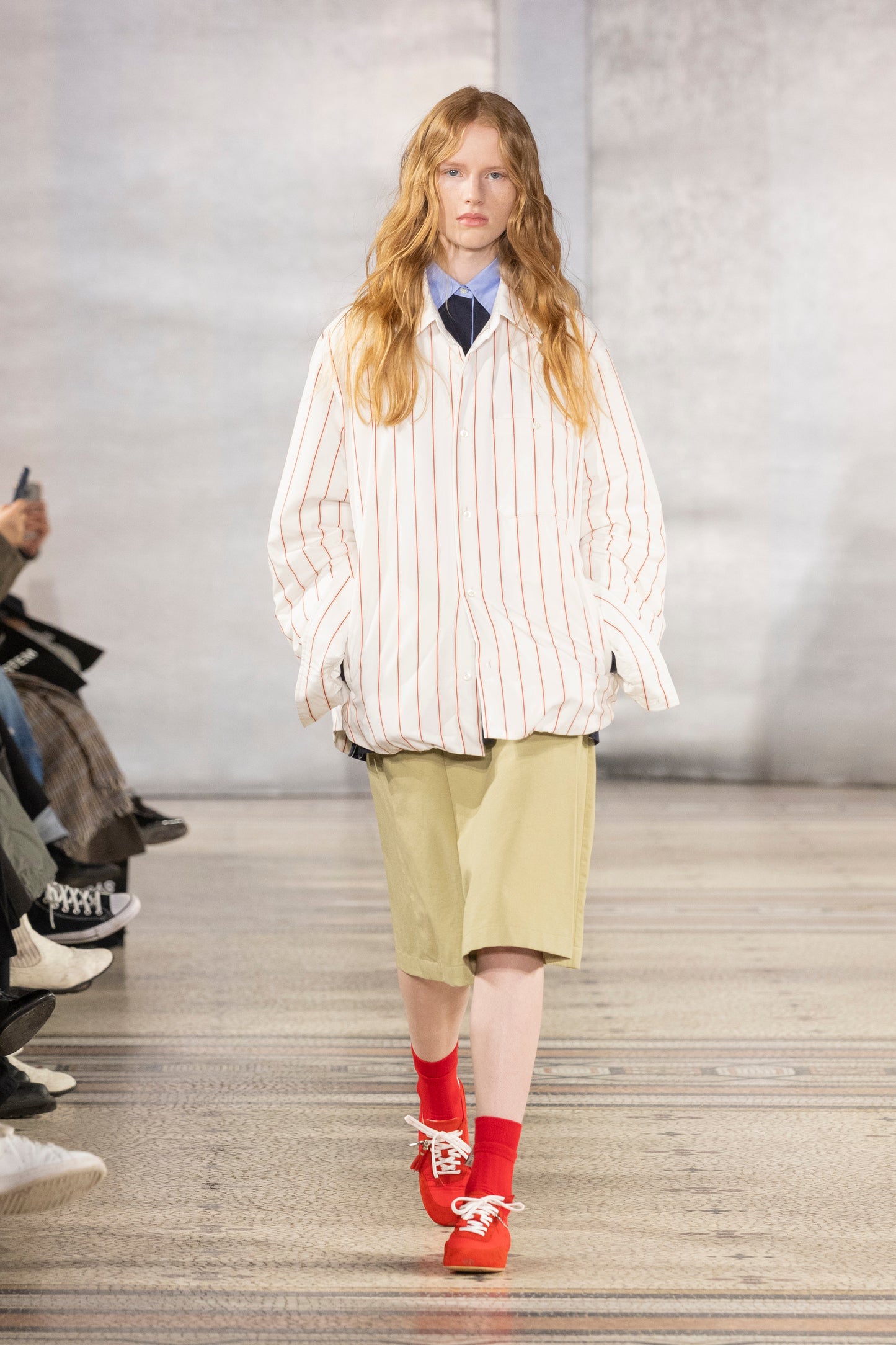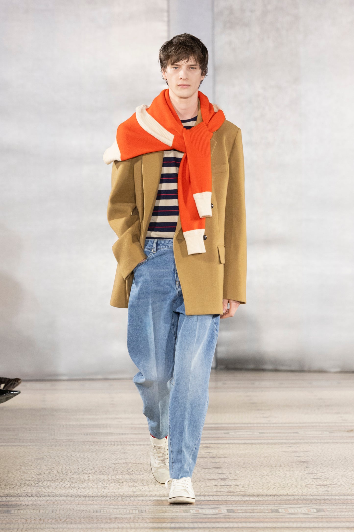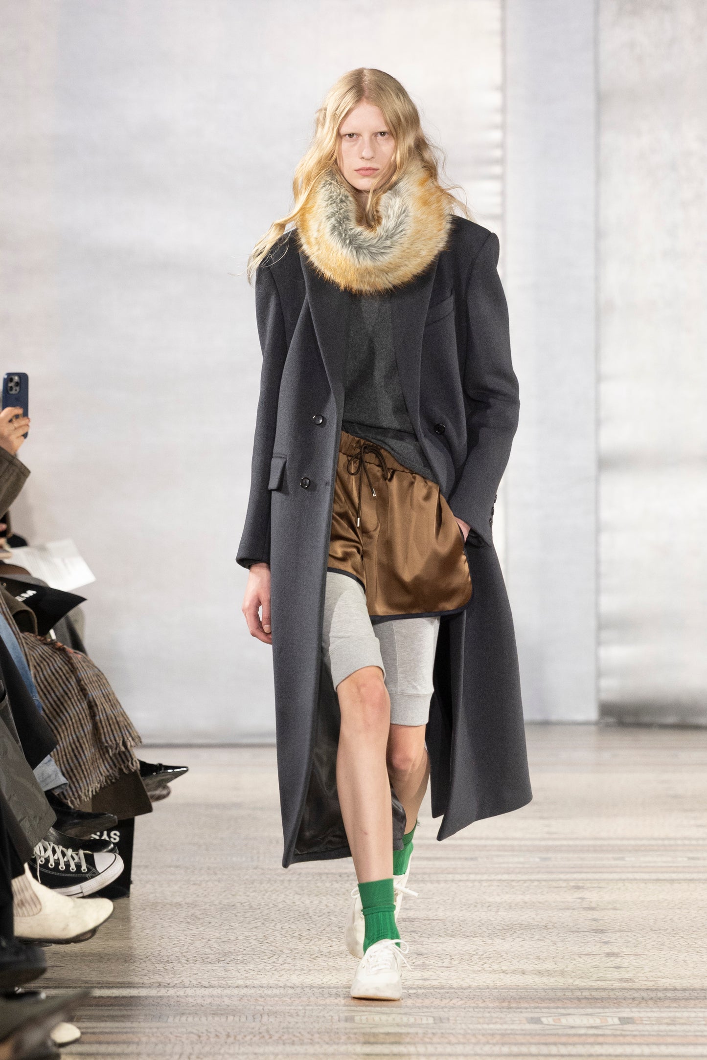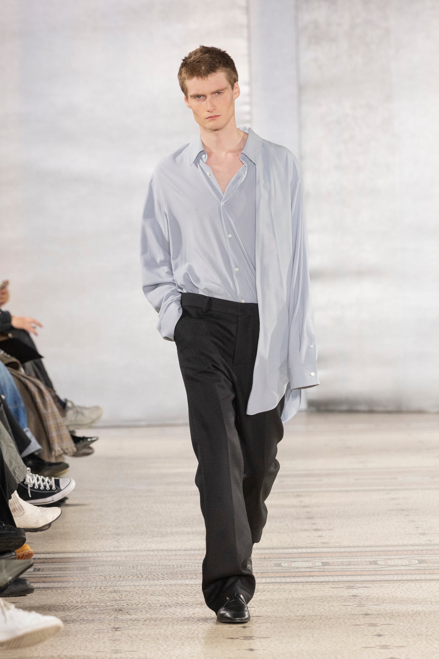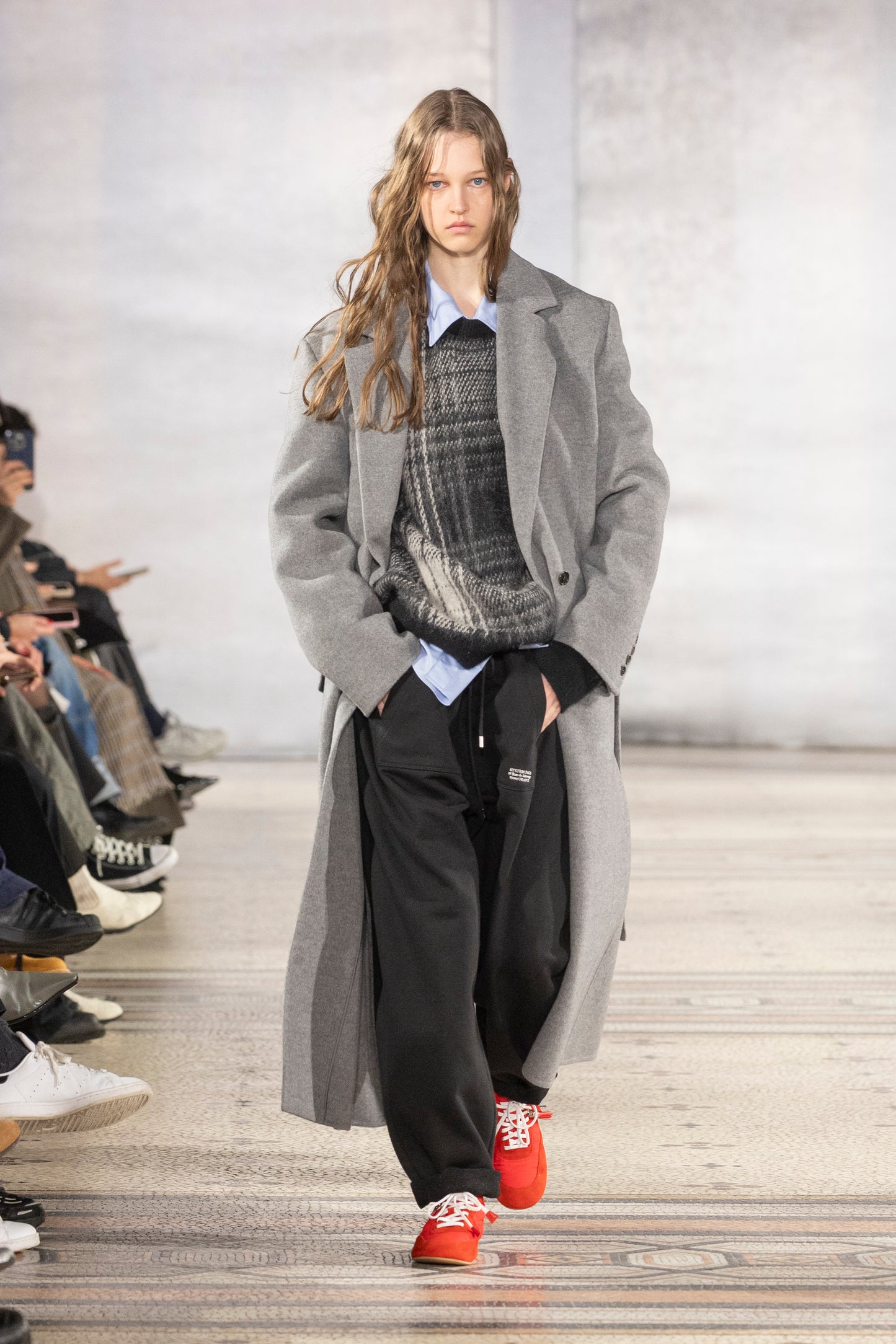 Materials and color further reinforce this narrative. Sued, corduroy, and washed velvet create powdery and tactile surfaces, while soft jersey and subtly lustrous leather introduce a contemporary street sensibility. A predominantly neutral palette is punctuated by vivid red and blue accents, infusing the collection with bold energy and individuality.