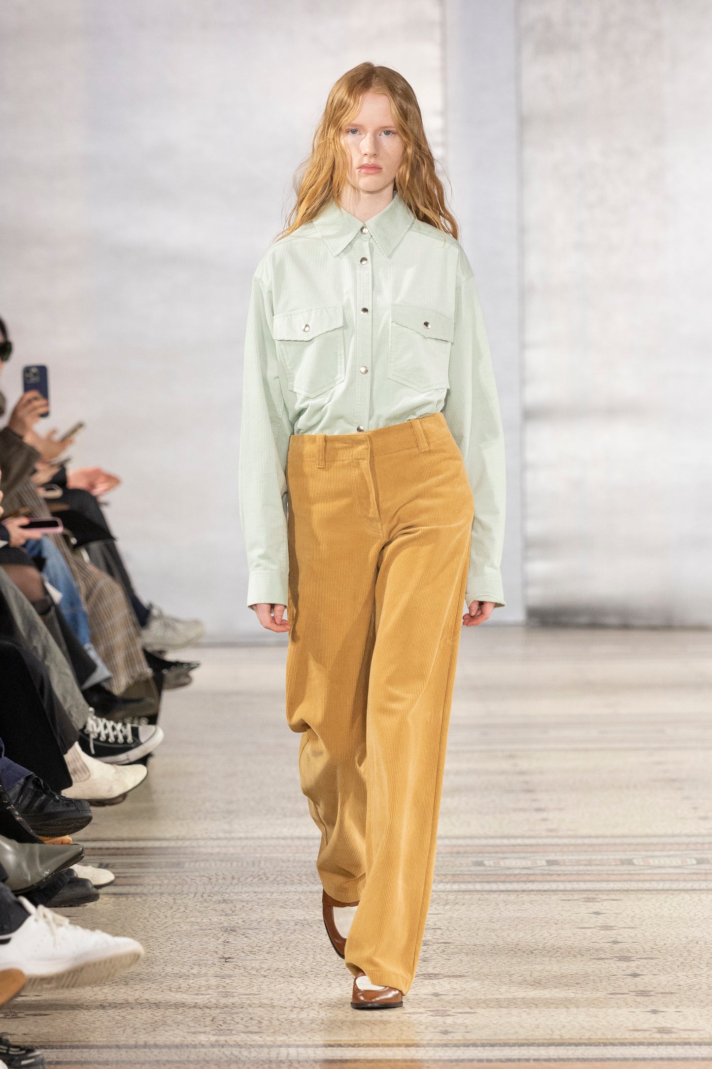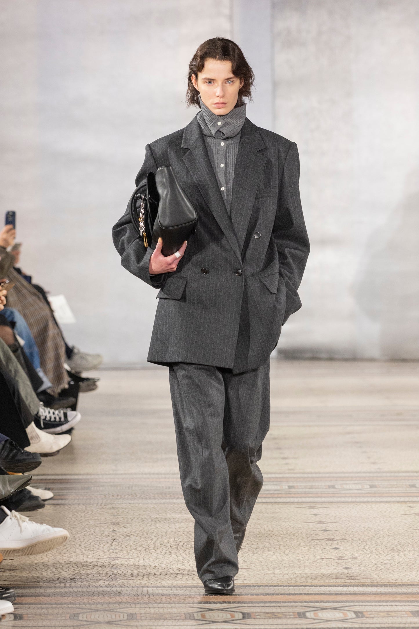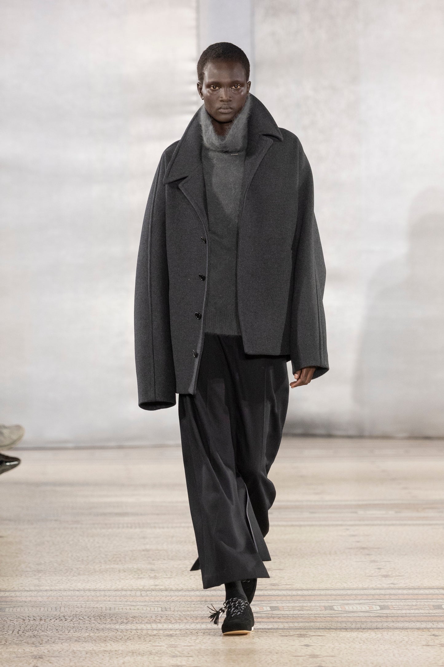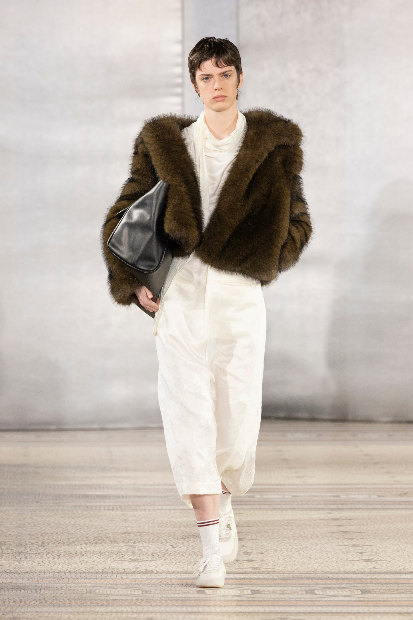 Materials and color further reinforce this narrative. Sued, corduroy, and washed velvet create powdery and tactile surfaces, while soft jersey and subtly lustrous leather introduce a contemporary street sensibility. A predominantly neutral palette is punctuated by vivid red and blue accents, infusing the collection with bold energy and individuality.