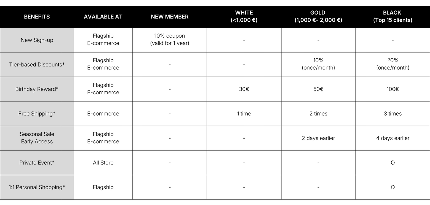 - Birthday Rewards: Celebrate with a special gift on orders over €200. (This reward can be combined with other existing discounts.)