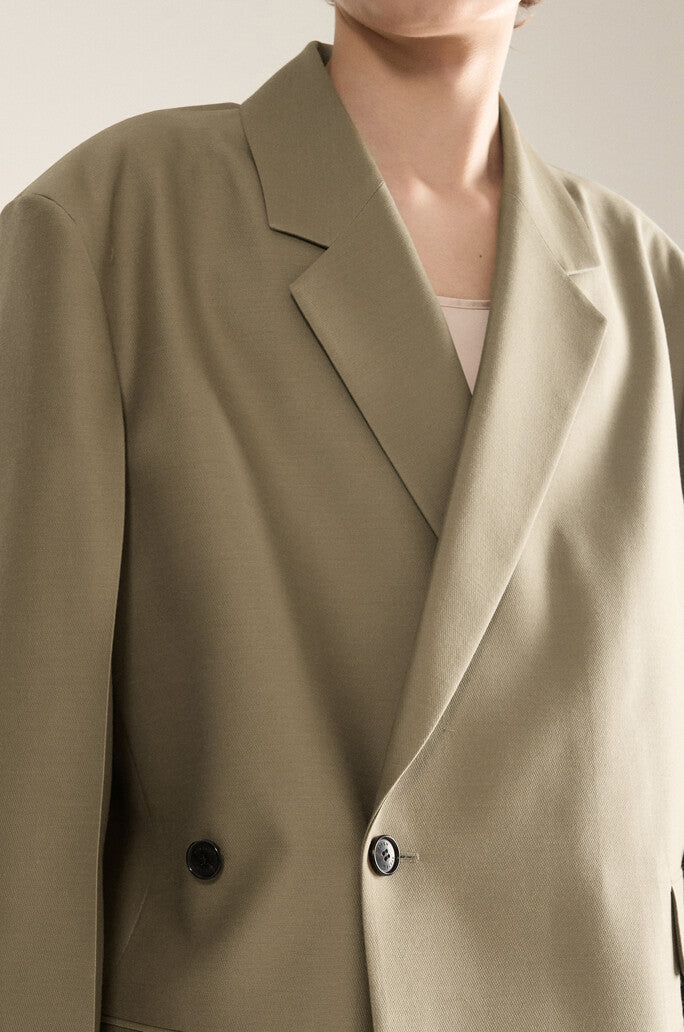 This jacket, which can be styled with various silhouettes by adding two buttons to the waist line, is luxuriously finished with a soft wool and silk blend material. The padding on the inside of the shoulder creates a neat outfit, and the double flap pockets on one side add a practical point. The relaxed oversized silhouette and hip-covering midi length make it easy to match with any look.