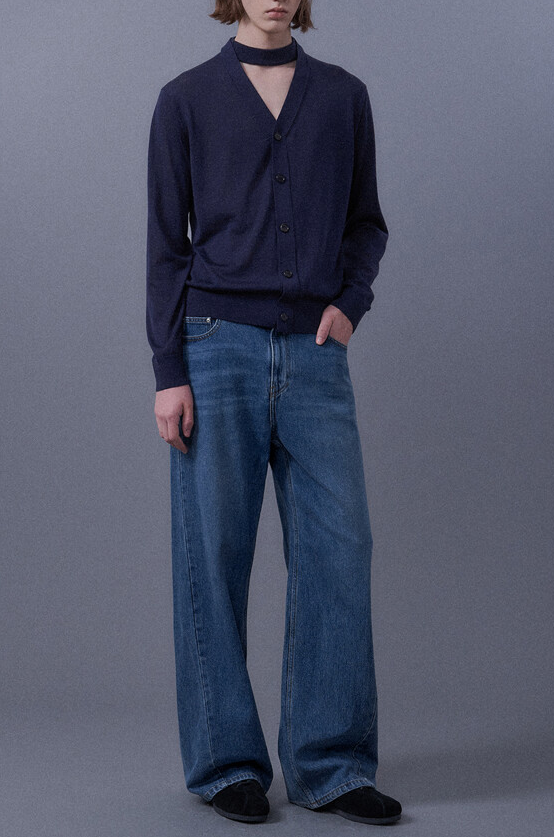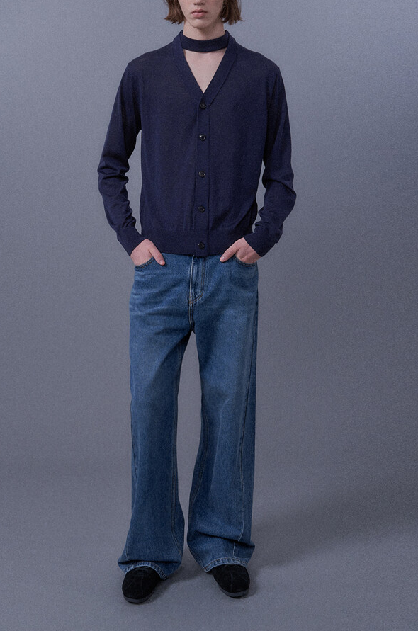This wool knit top, with its simple construction, boasts a distinctive silhouette and detailing. A naturally flowing V-neckline, rounded rib blocks frame the neckline, and subtle cutouts add a subtle touch of individuality. Woven from 100% wool, it's lightweight yet warm, perfect for any season. Ribbed hem and sleeves add structure, adding a modern touch to classic knitwear, making it a versatile piece for any season.