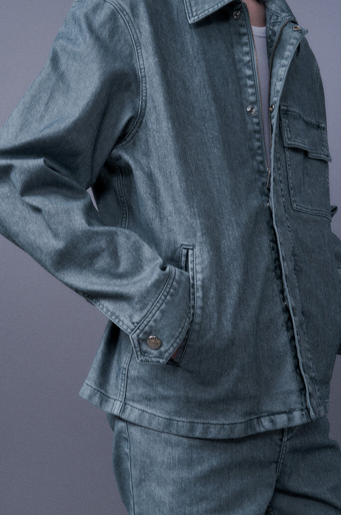 Flocked Denim Jacket crafted from glossy denim fabric for a modern twist on a classic style. Designed with a clean silhouette, it features side pockets and a single chest pocket for added practicality. This versatile jacket combines casual comfort with subtle shine, making it a stylish layering piece for everyday wear.
