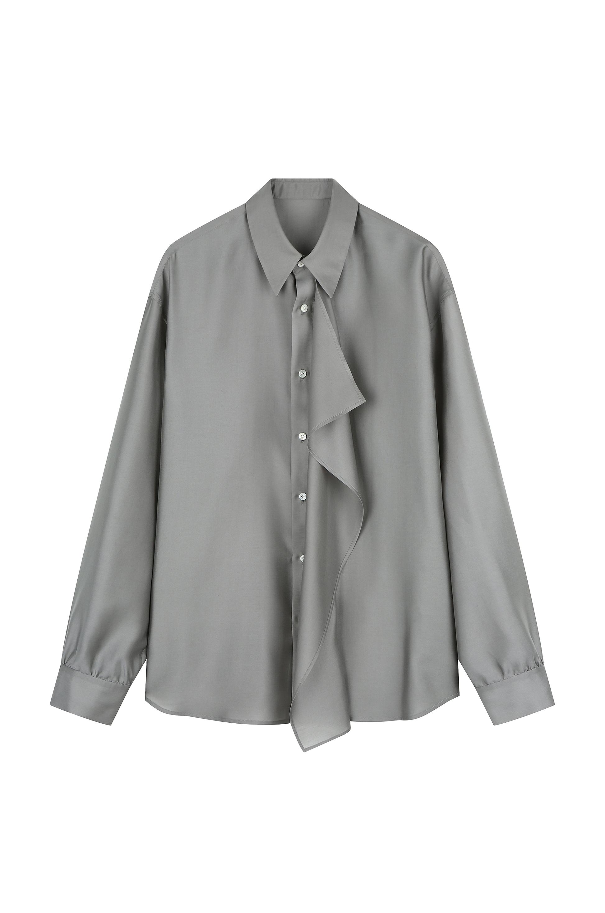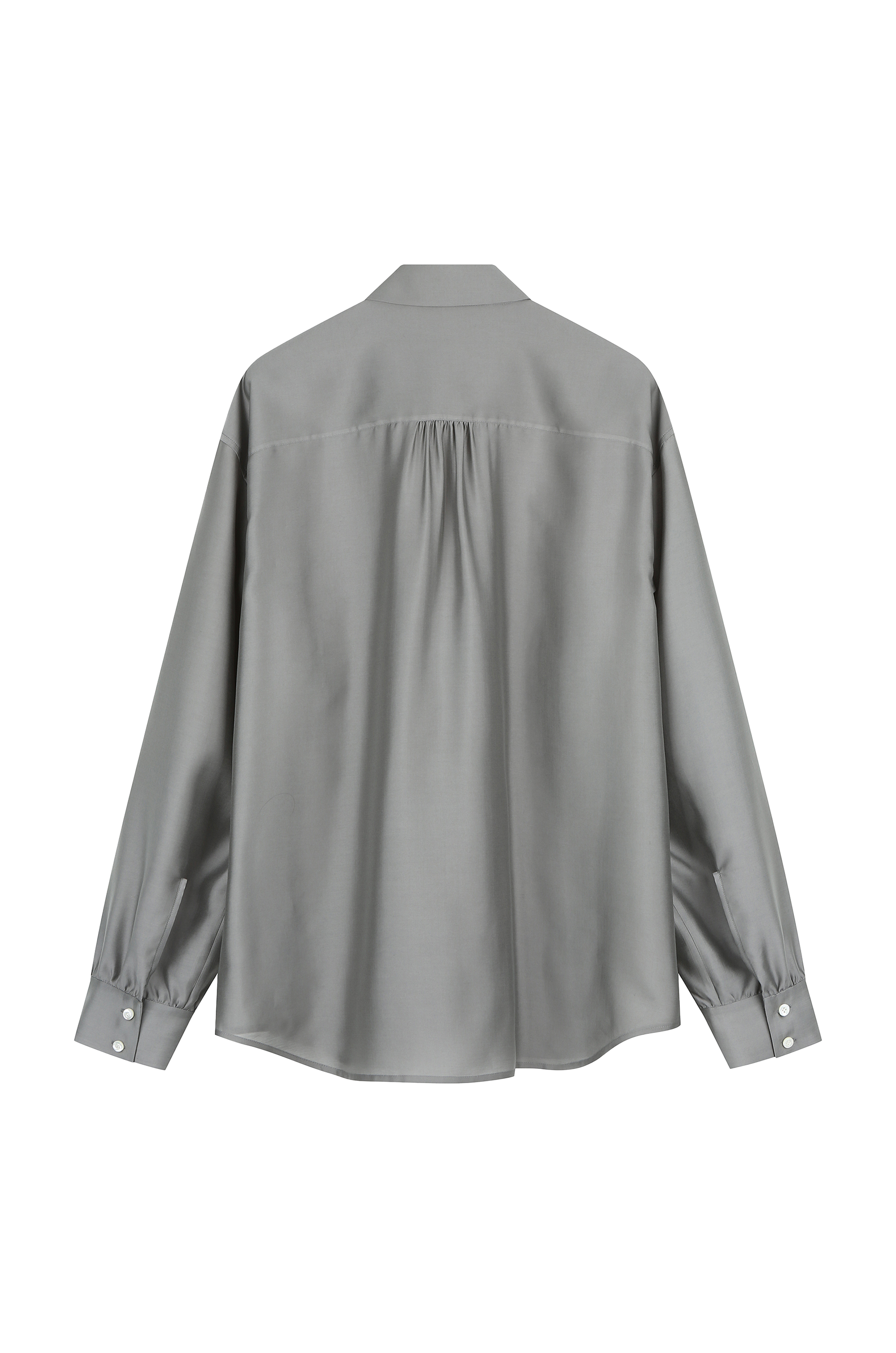 This scarf shirt has a smooth, silk-like texture with a refined drape. Lightweight and soft against the skin, it adds a touch of elegance to any look. Its subtle sheen and fluid silhouette make it a versatile piece, perfect for both casual layering and dressed-up styling.