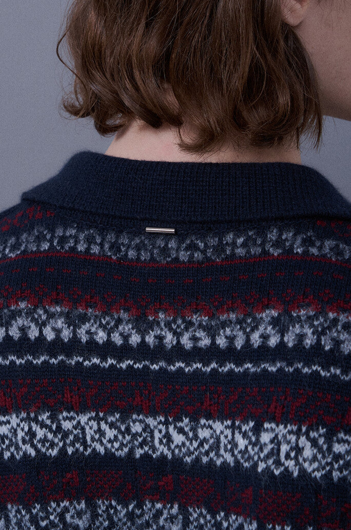 The Print Mixed Knit Cardigan features a unique blend of two different knit fabrics, creating an eye-catching patterned design. Crafted from a soft and cozy yarn blend with wool and cashmere, it offers warmth and luxurious comfort. This versatile cardigan adds texture and style to any outfit.