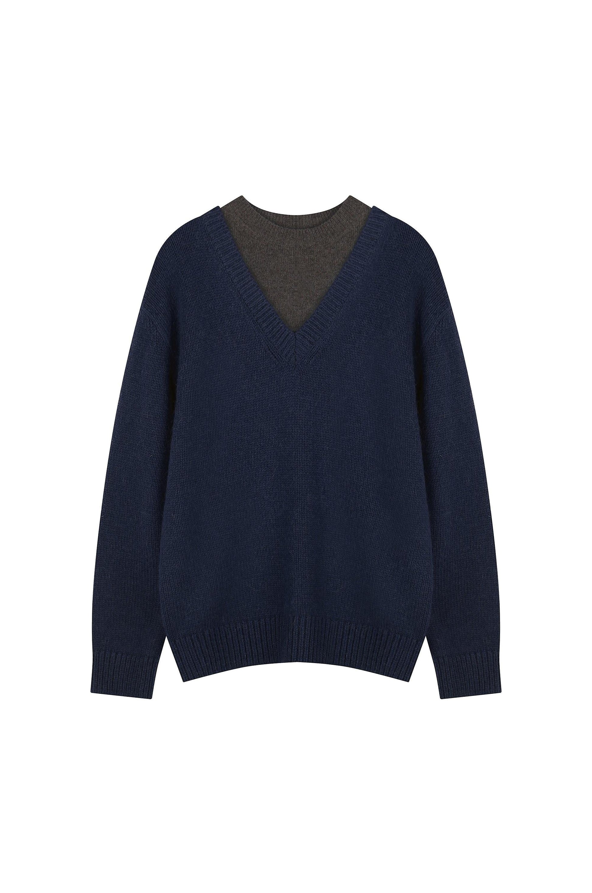 Crafted from a soft alpaca–wool blend, this knitted top features a unique layered neckline design that combines both a round neck and a V-neck. The double-layer effect creates a modern, dimensional look while highlighting the natural warmth and texture of the knit. Lightweight yet cozy, it’s a versatile piece that can be styled on its own or layered with outerwear for added depth. A refined knit that blends comfort, functionality, and contemporary detail.