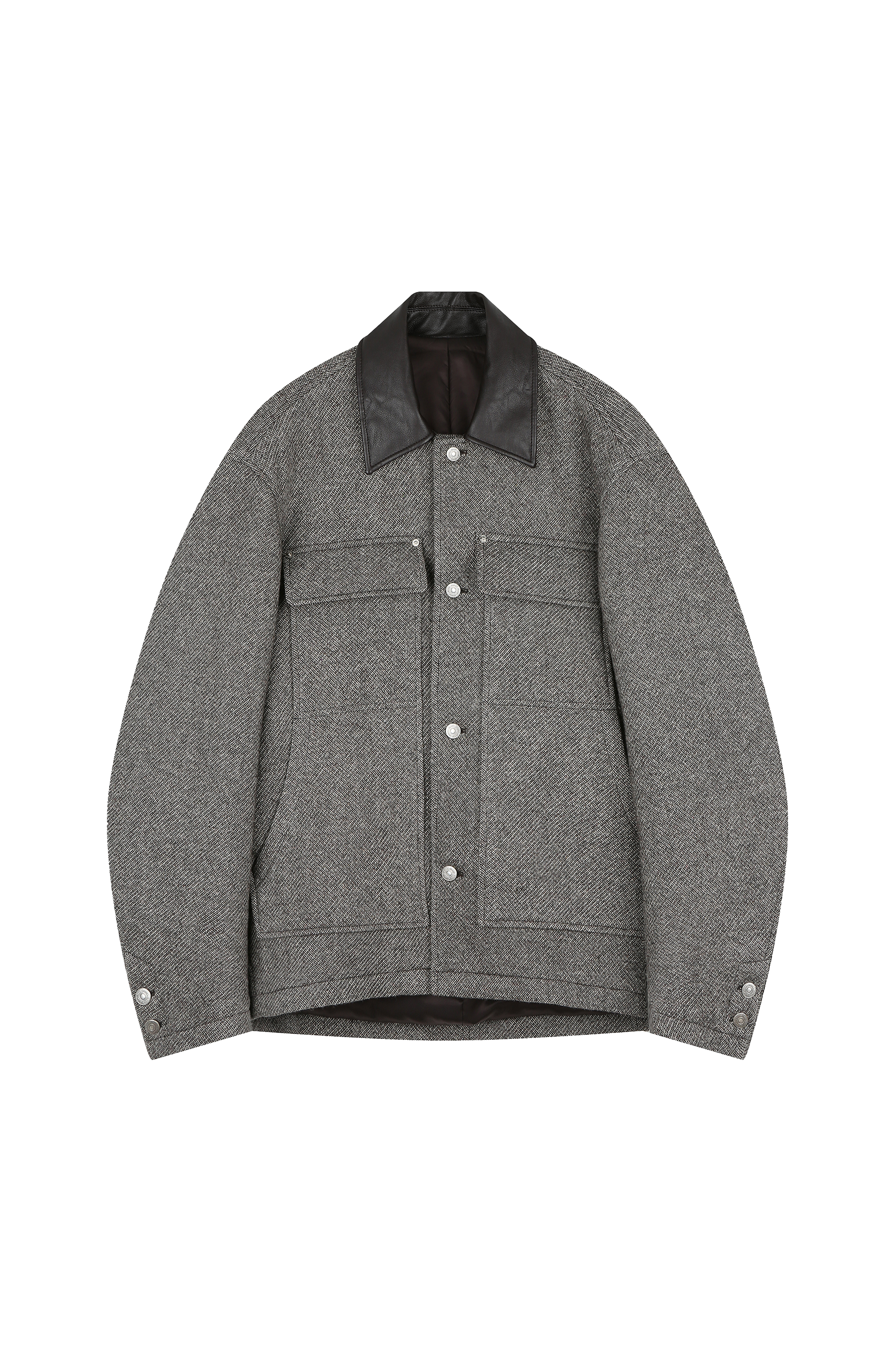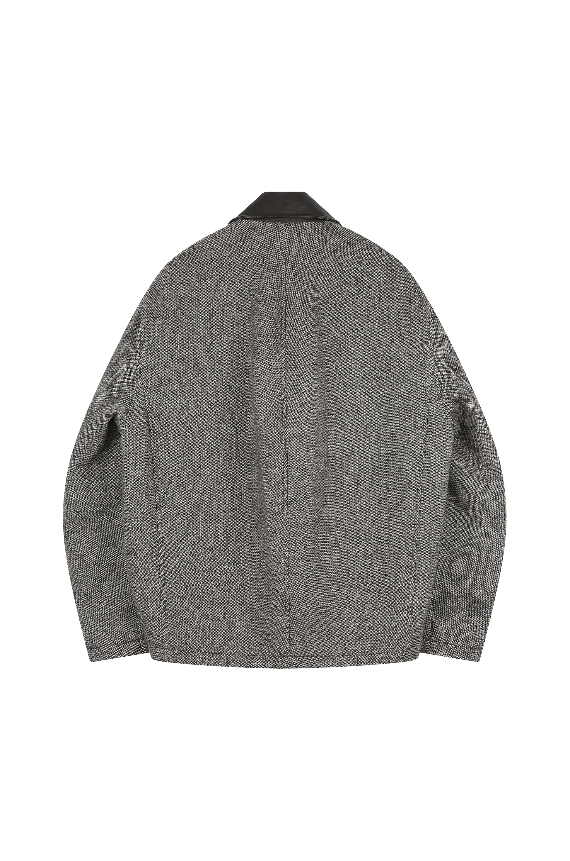 This jacket combines a classic melange color with a leather-textured collar. The wool and cotton blend offers a solid yet soft touch. Pockets on both sides, flap pockets on both chests, and an inner pocket add practicality. The relaxed, regular silhouette allows for versatile styling with inner layers, making it a perfect everyday piece for the transitional season.