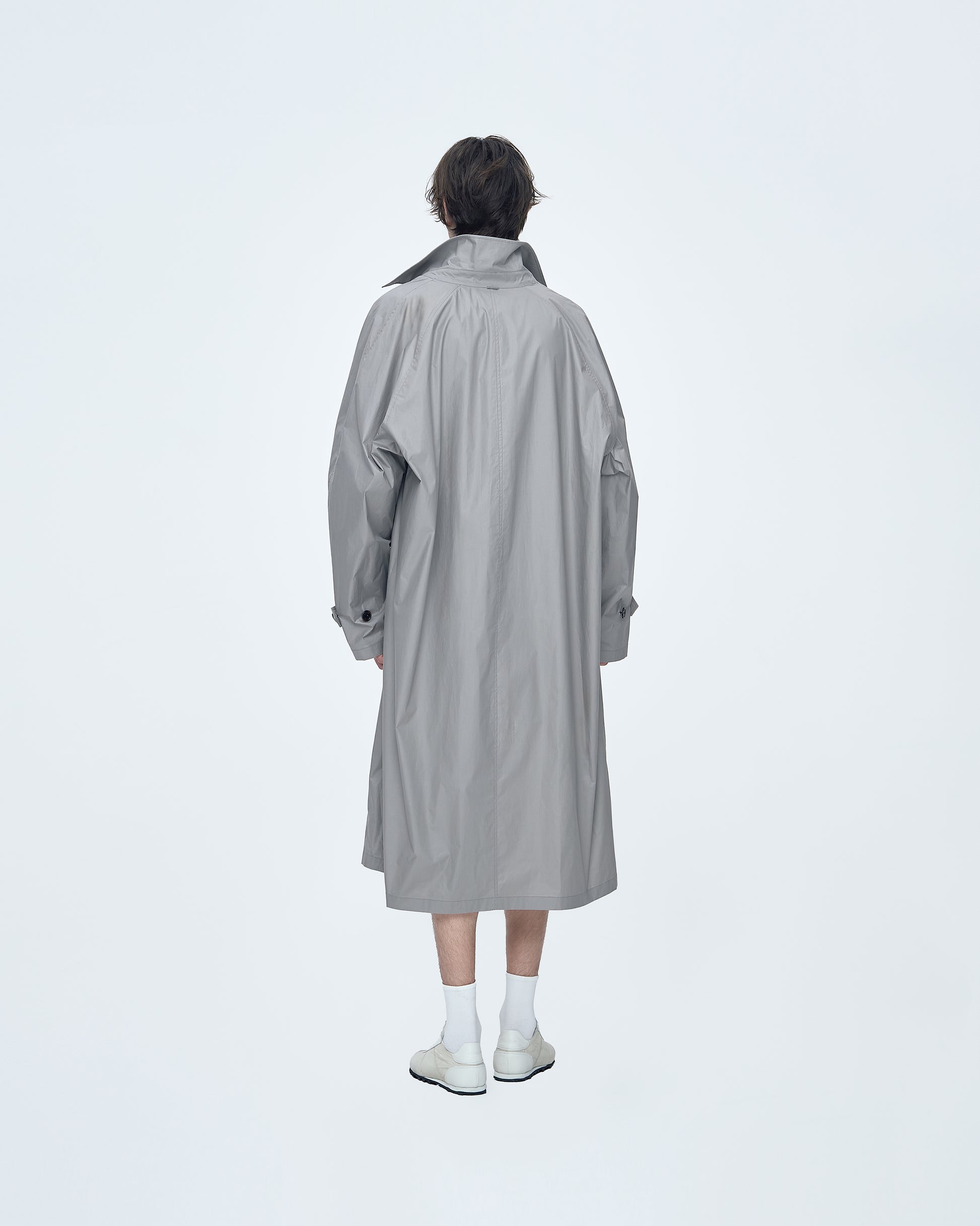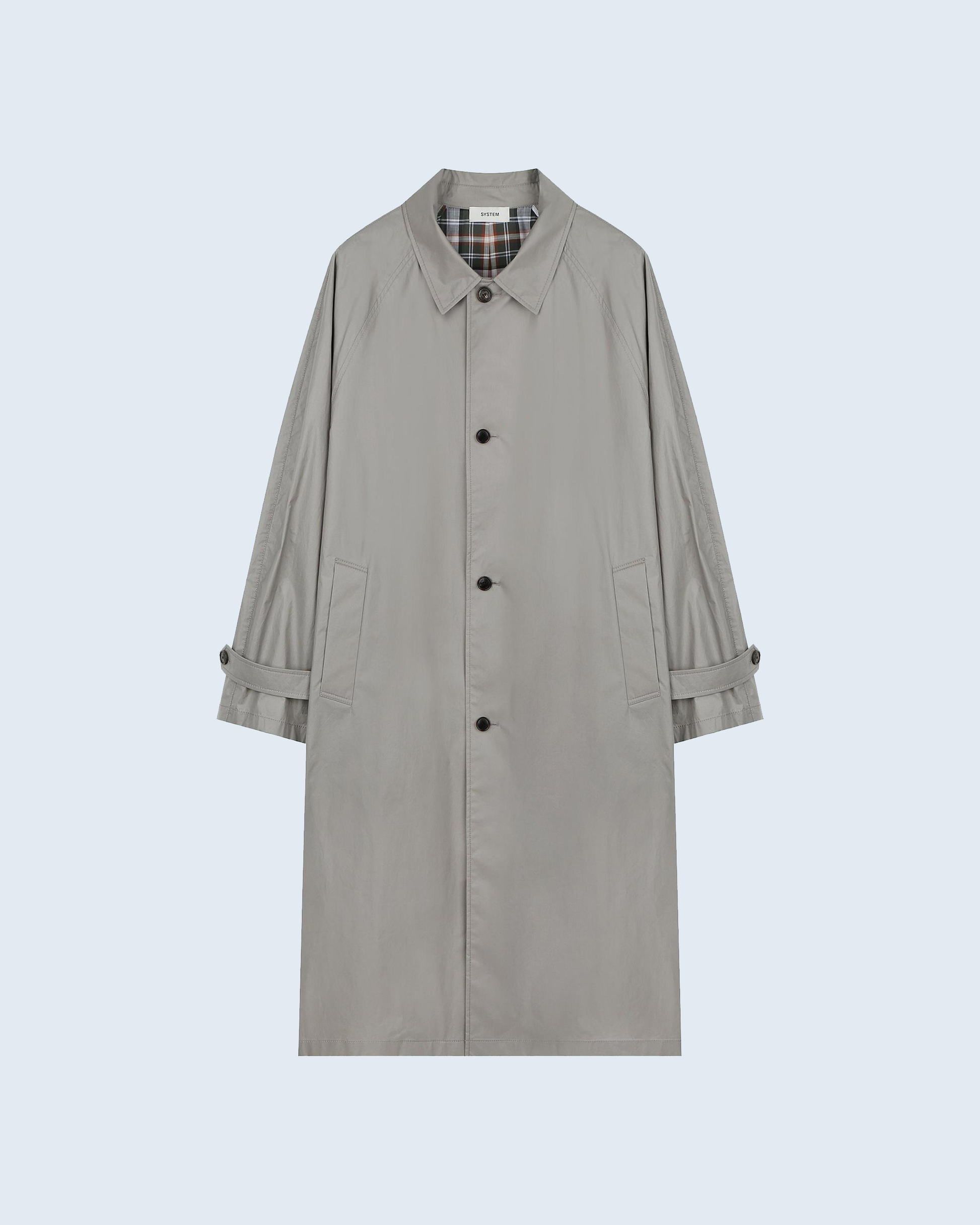 Balmacaan-style coat designed with a subtle check pattern on the interior, adding a refined detail beneath a clean outer silhouette. The classic shape and structured fabric create a timeless look with understated character.