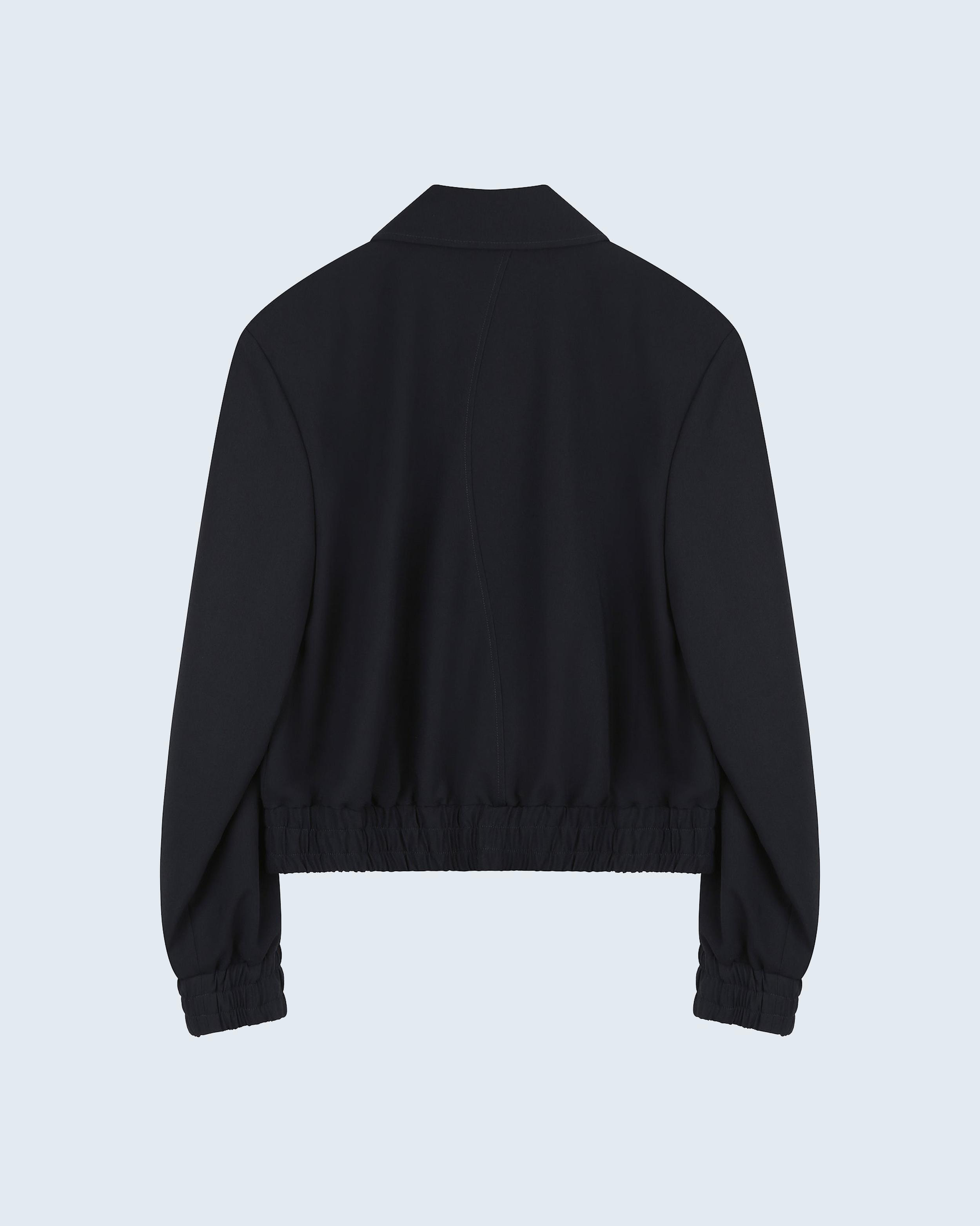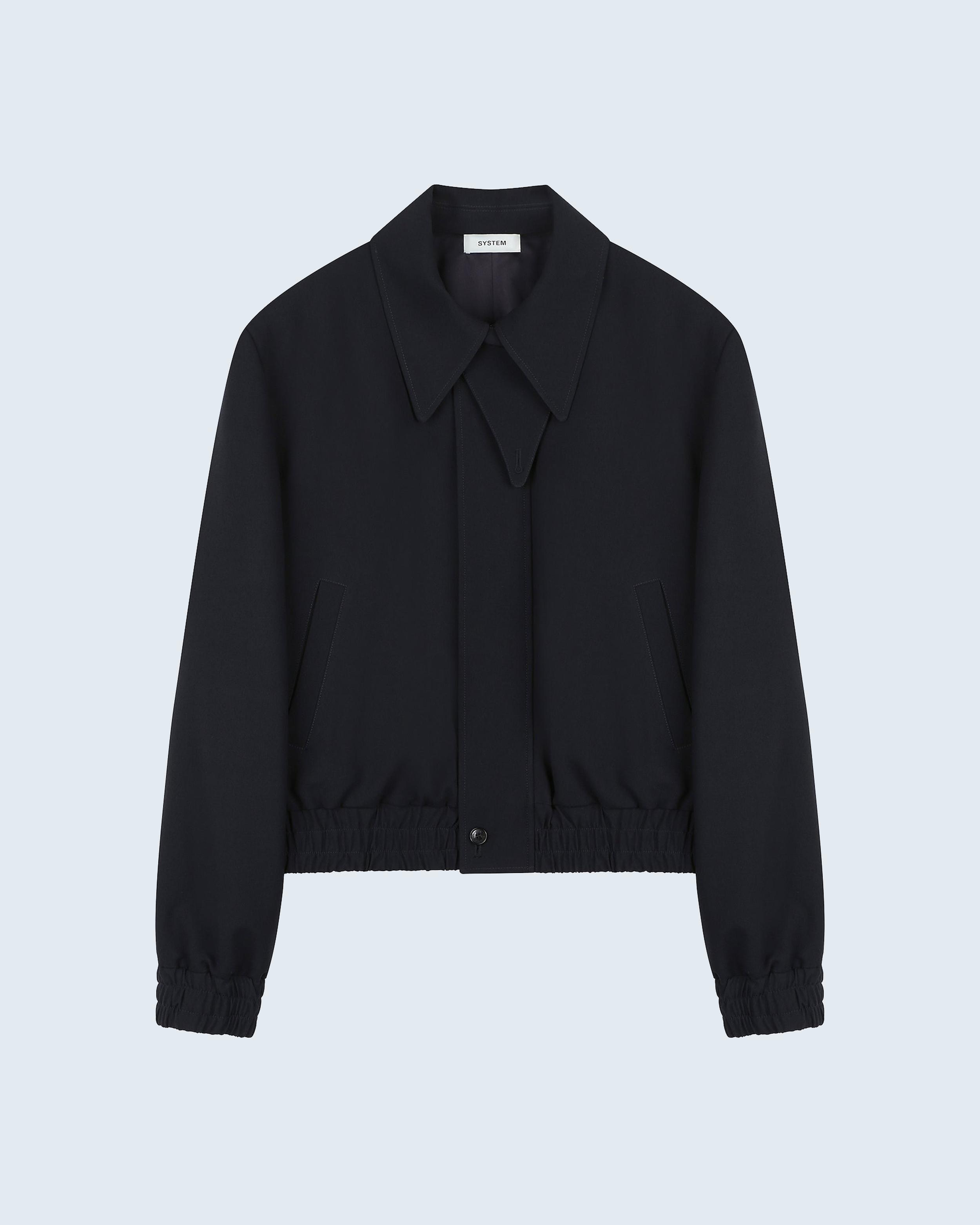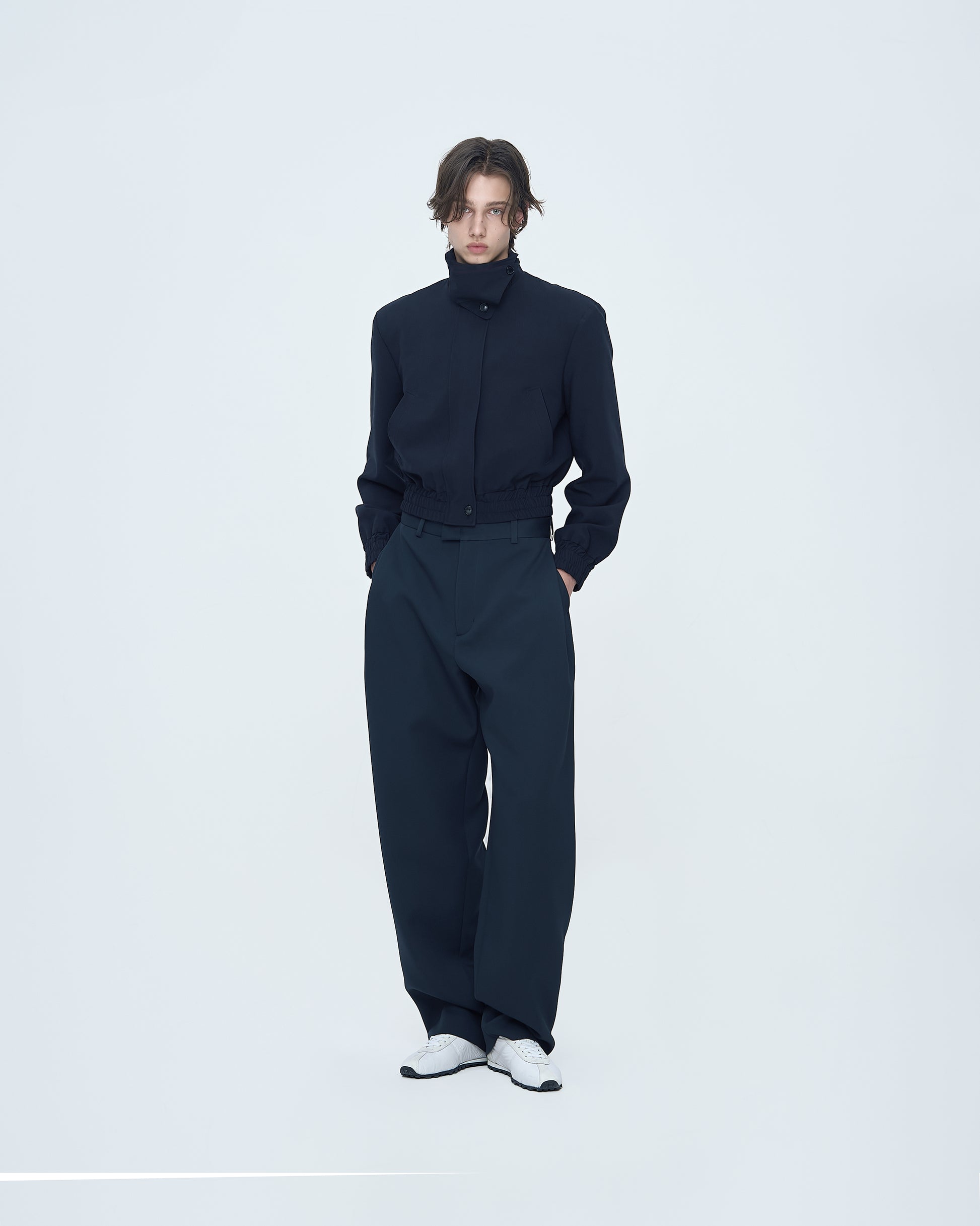A jumper designed with a raised collar and chin strap detail that allows the neckline to wrap around the neck like a turtleneck. The adjustable collar creates a protective, structured look while adding a modern, utilitarian edge.