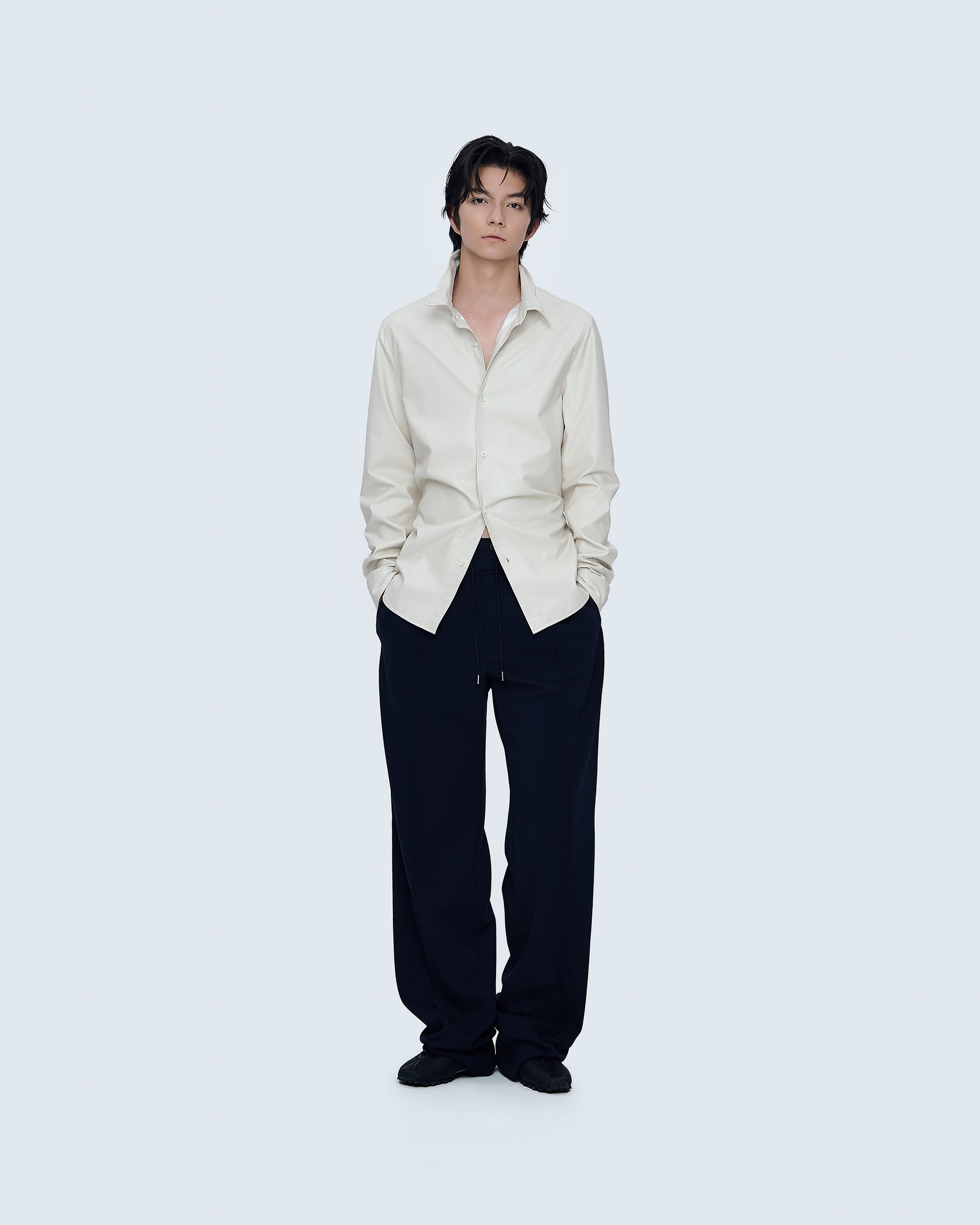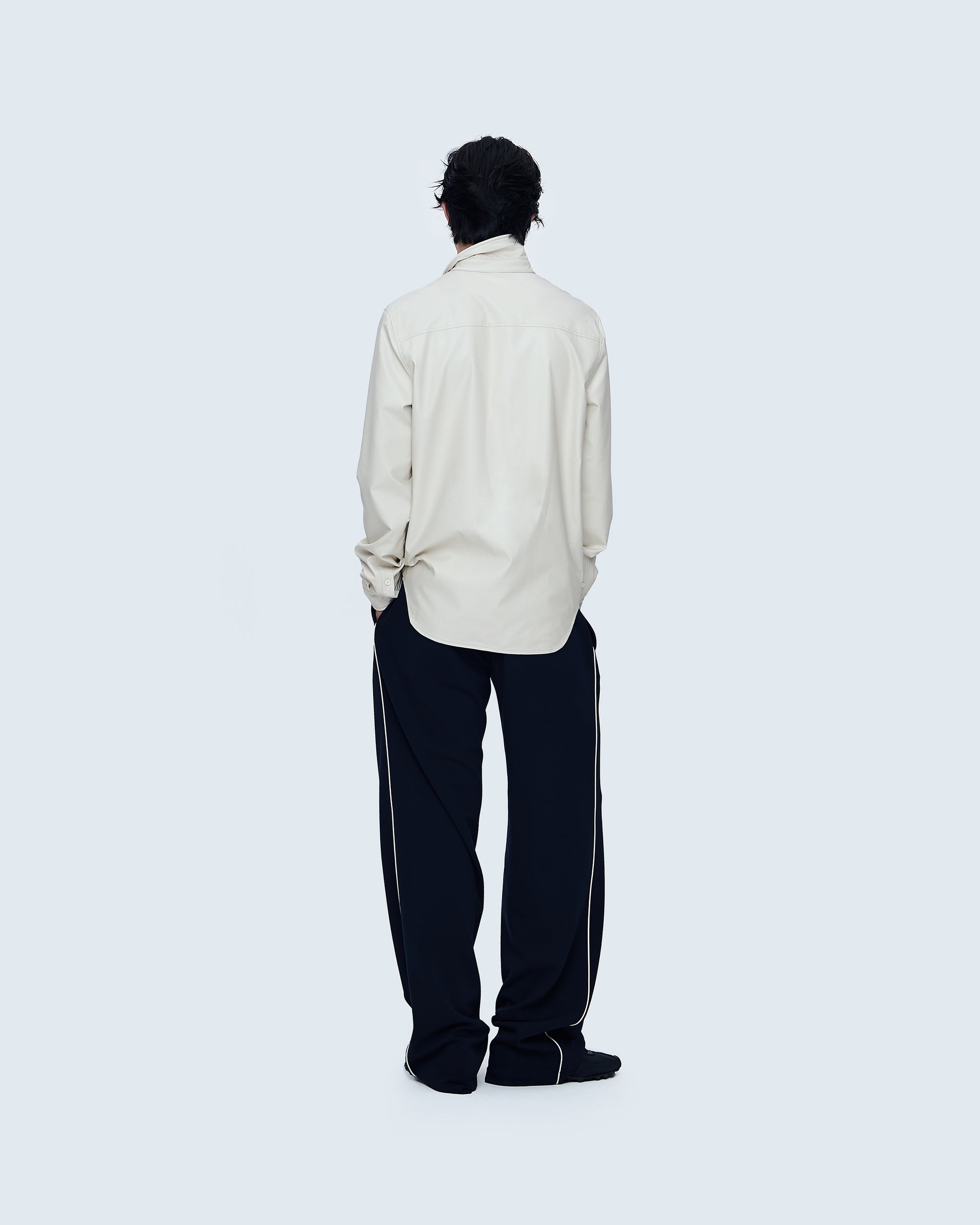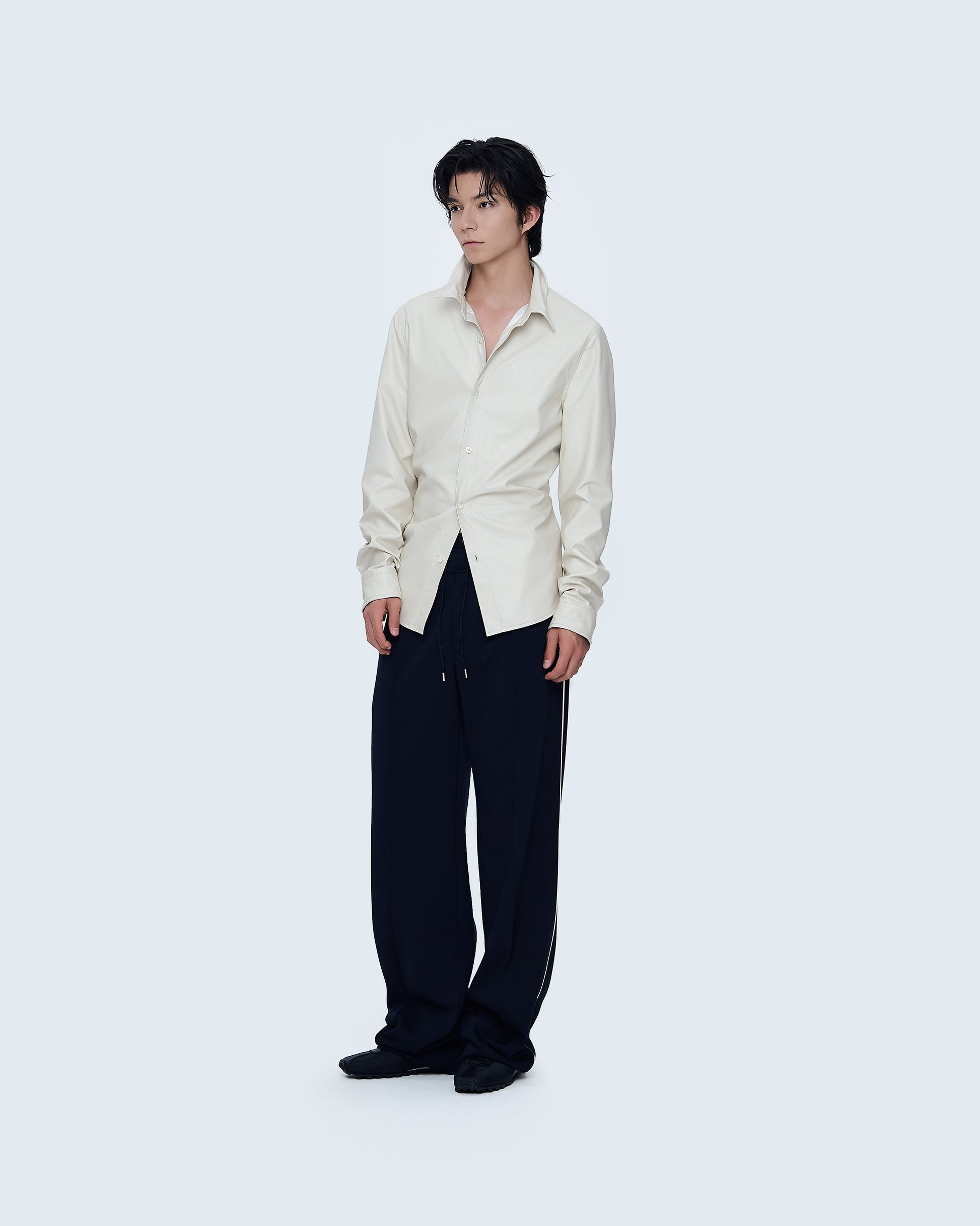 A shirt finished with a coated surface and a wire-inserted collar that allows flexible shaping. The structured yet modern design creates a sharp silhouette with a subtle edge, suitable for contemporary styling.
