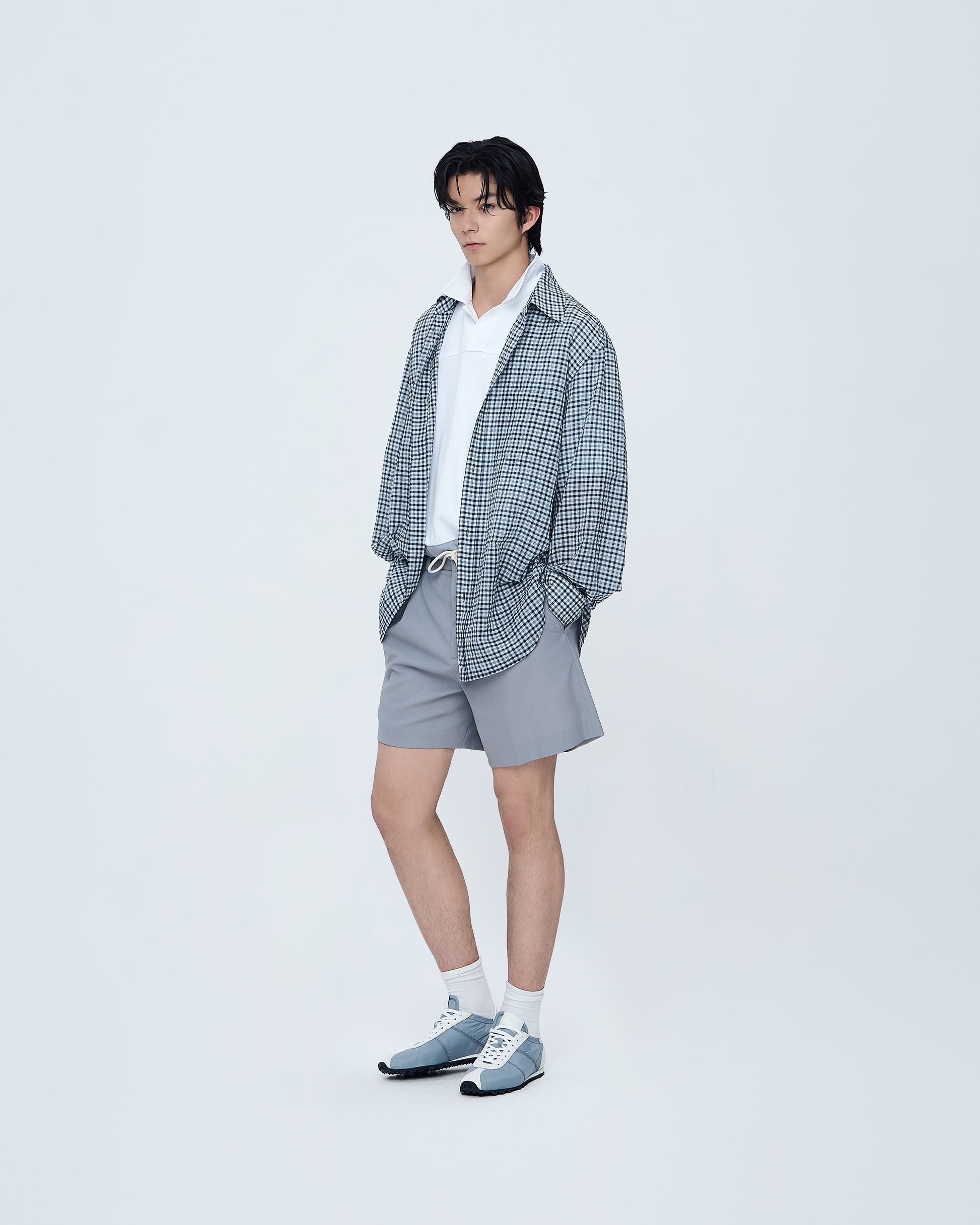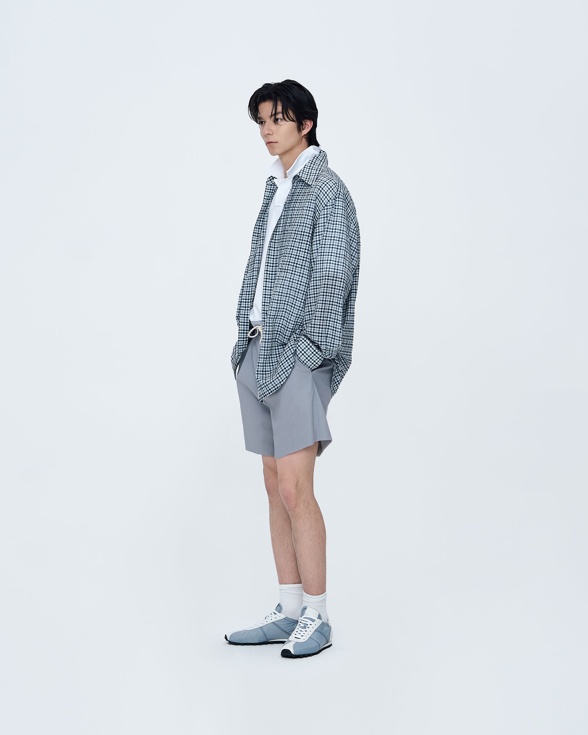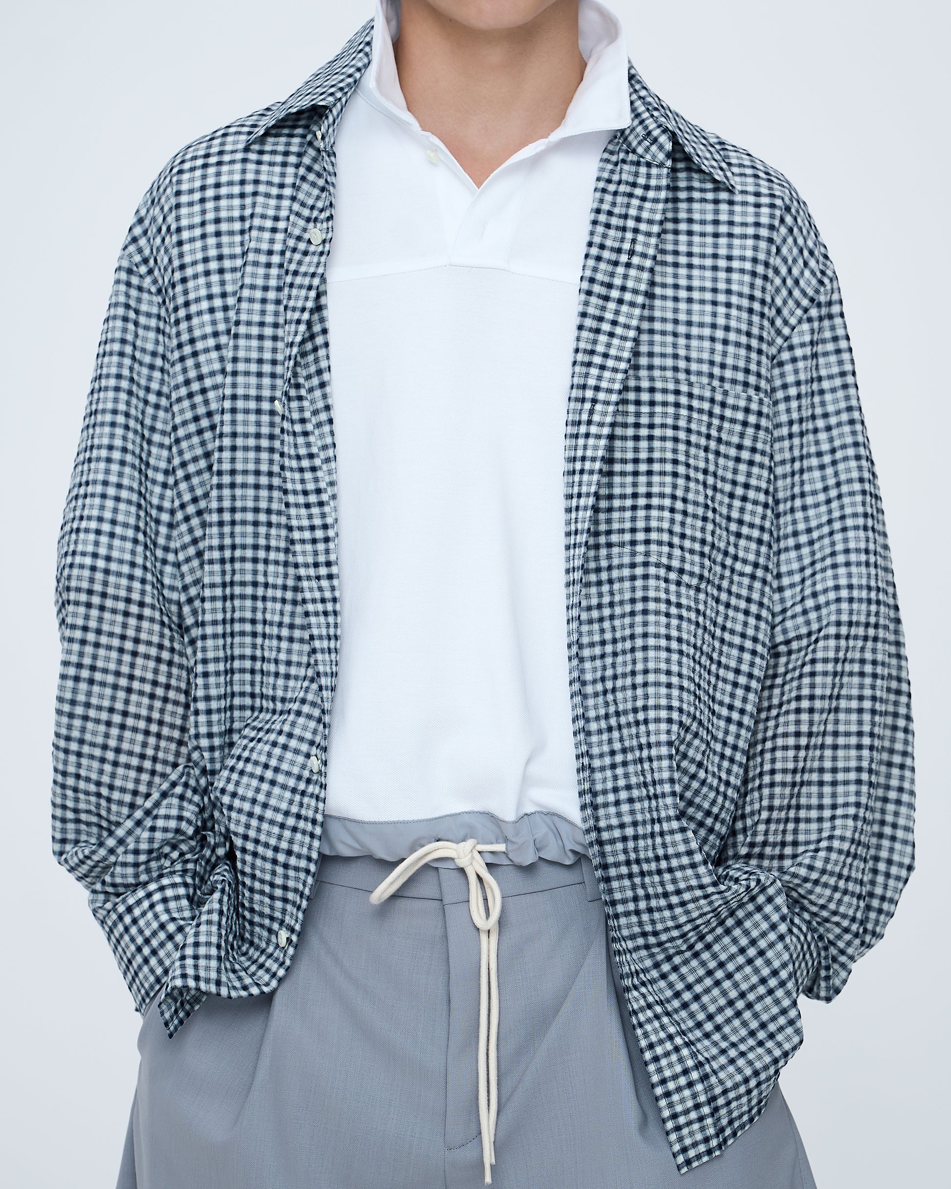 A shirt with a subtle small-check pattern, offering a classic and refined look. The lightweight fabric drapes comfortably, creating a clean silhouette suitable for both casual and polished styling.