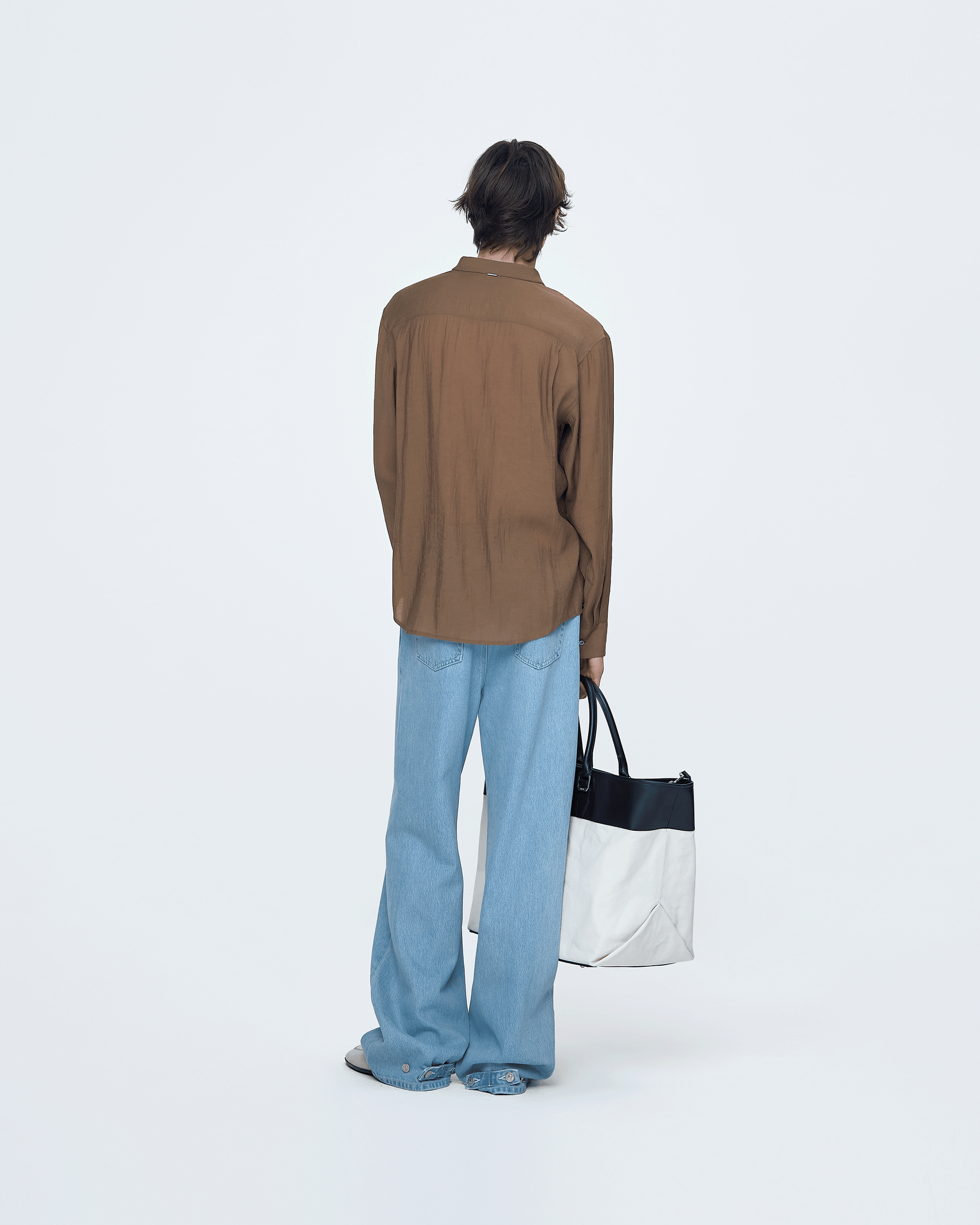 The subtle sheer texture and naturally wrinkled surface combine to create a light and sophisticated look. The naturally flowing silhouette offers a comfortable fit, and the clean shirt collar and hidden button closure complete the minimalist aesthetic. The loose sleeves and button cuffs create a balanced overall look, making this piece versatile enough to be worn alone or with slacks or denim for a variety of looks.