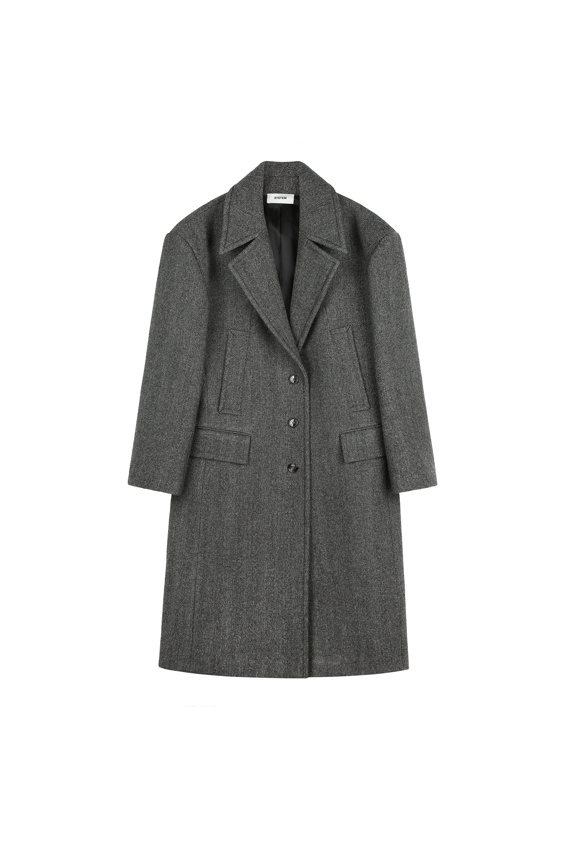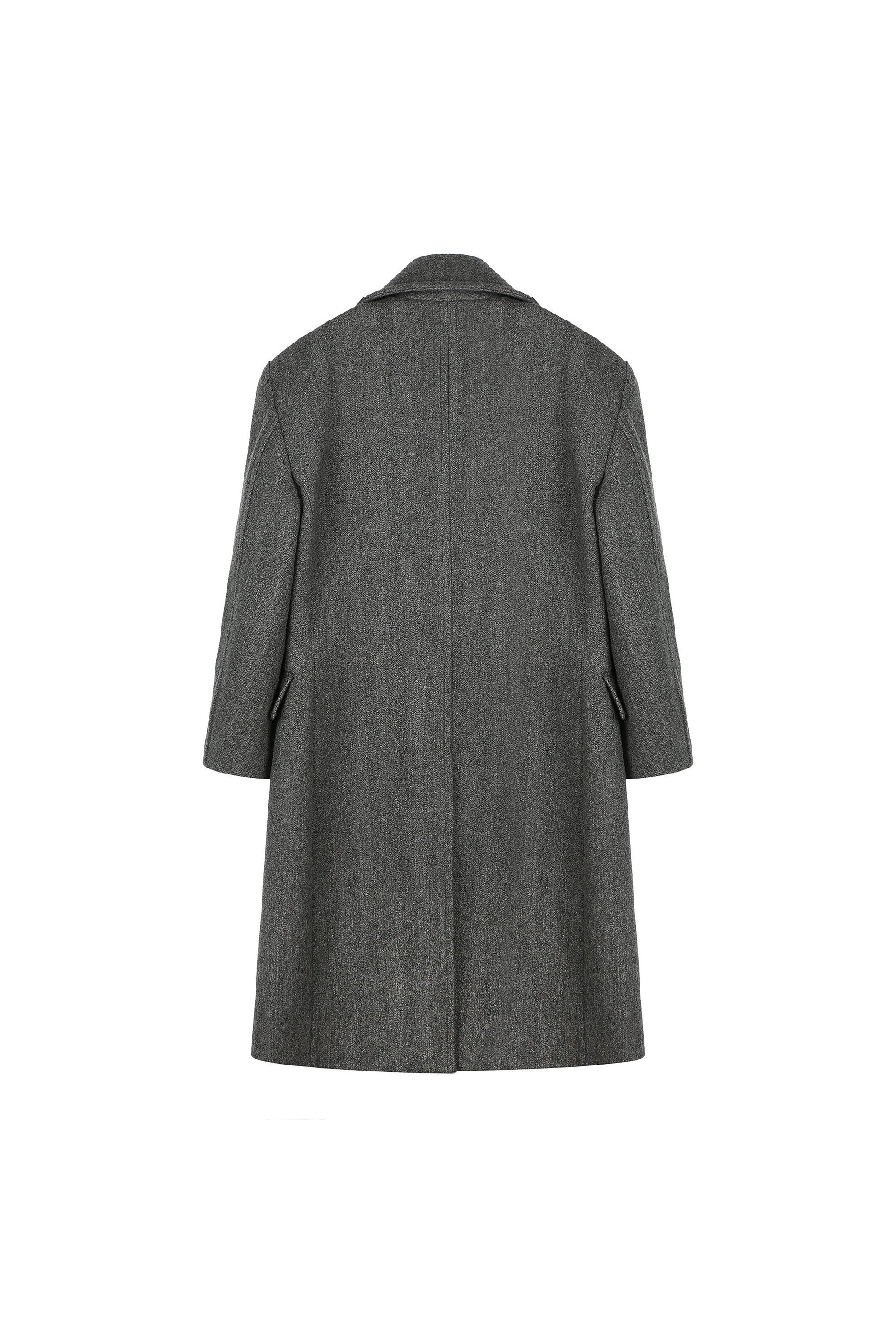 The voluminous silhouette of this coat is enhanced by padded shoulders, creating a smooth and structured appearance. The sophisticated melange color, a blend of varied tones, adds depth to its design, while the oversized wide collar introduces a stylish, modern flair. With functional front twill and flap pockets, this coat balances both practicality and fashion effortlessly. Crafted from a luxurious heavyweight wool blend, it offers warmth and comfort while maintaining its premium aesthetic. The back hem slit adds movement to the design, making it an ideal choice for refined, contemporary outerwear.