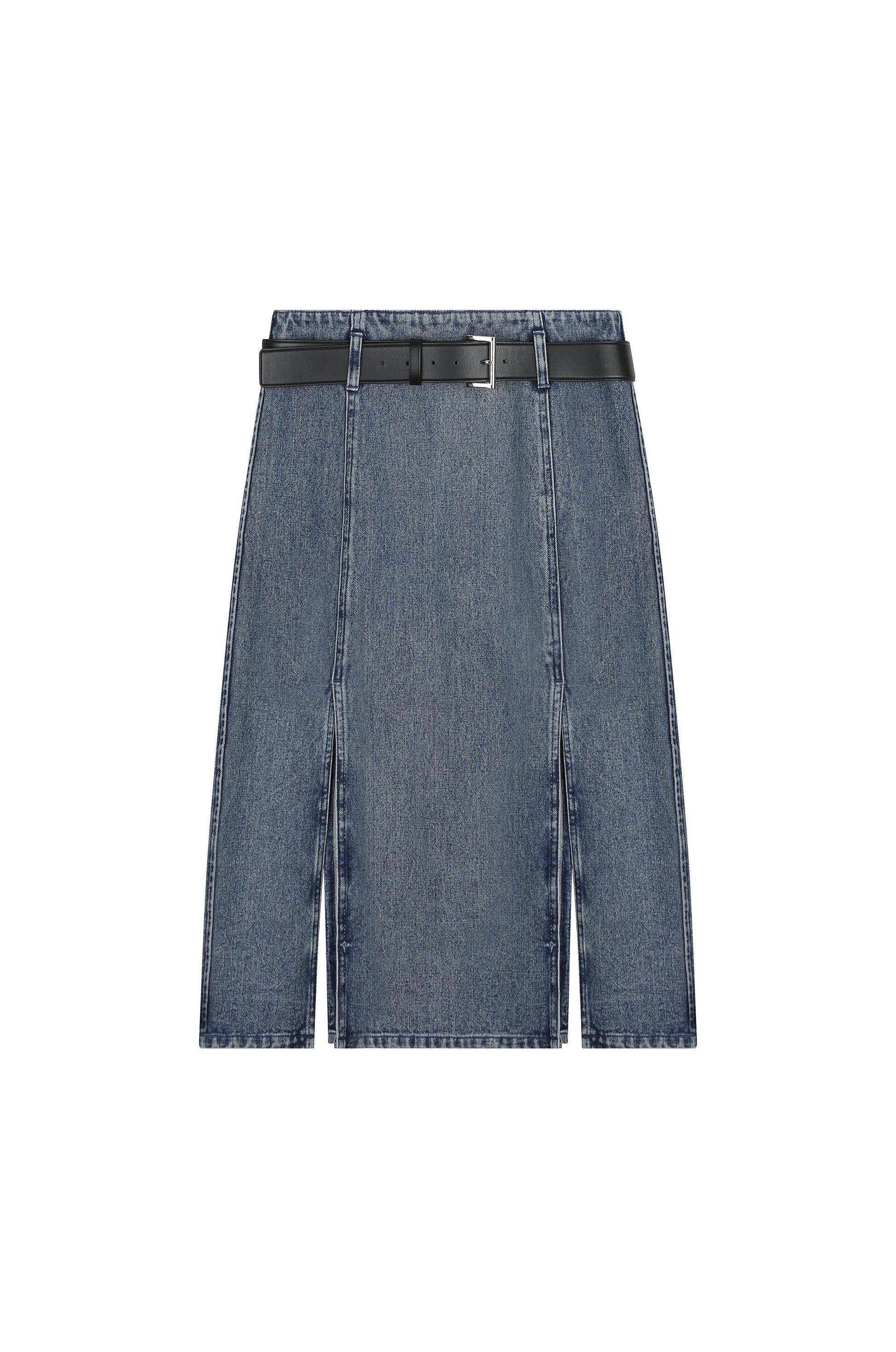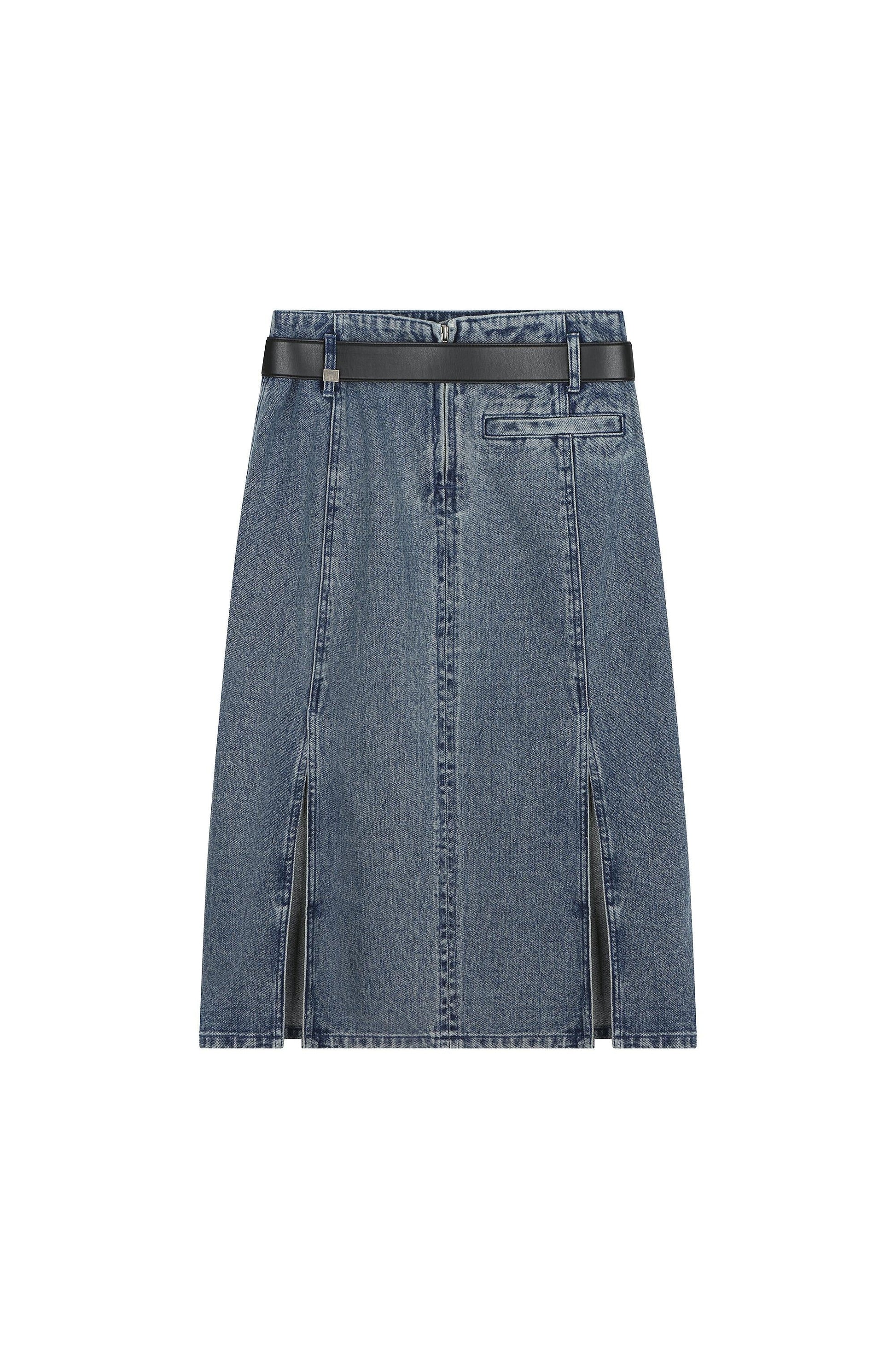 This Slit Denim Midi Skirt combines classic denim with bold design details. Featuring two striking slit lines on both the front and back, extending up to the thigh, it adds a touch of daring style to a timeless silhouette. The midi length offers a balanced and flattering look, while the included belt cinches the waist for a more defined shape. Perfect for pairing with a variety of tops, this skirt is a versatile and chic addition to your wardrobe, effortlessly blending comfort and modern style.