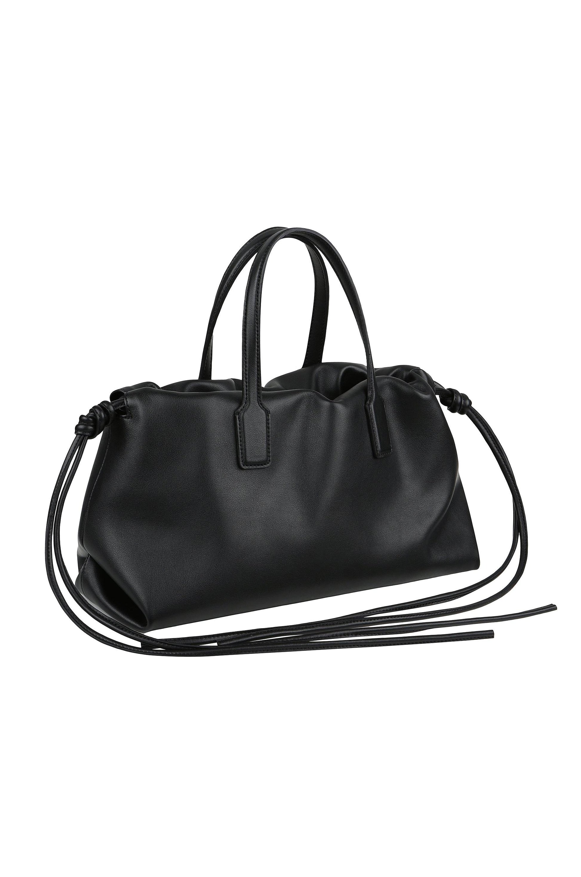 This tote bag is luxuriously finished using cowhide material with a subtle sheen and soft touch. The interior is practical with an appropriate amount of storage space, and the magnetic closure and drawstring at the top can be tightened to safely store your belongings. This item is good to match anywhere with its basic color and design.