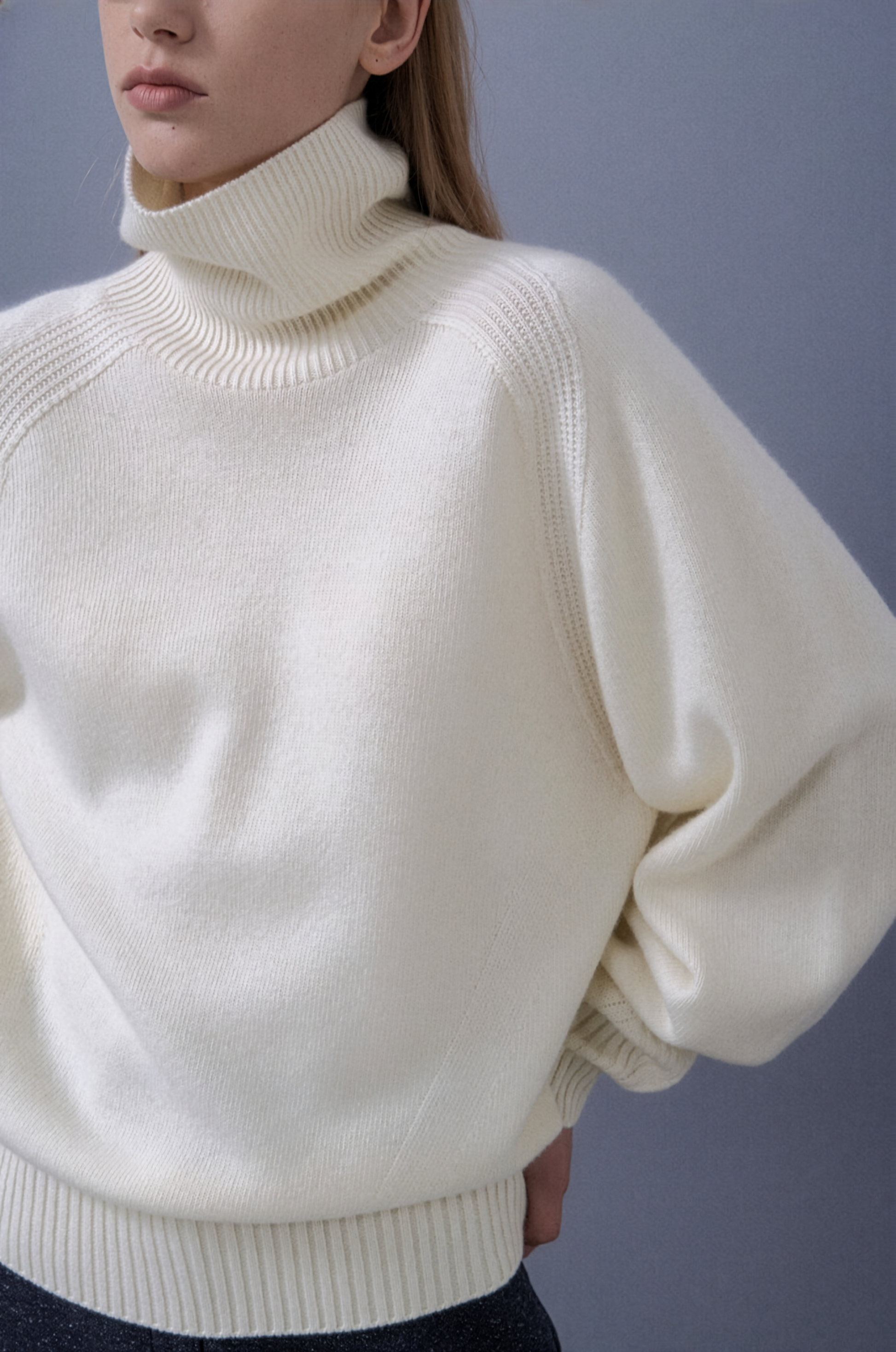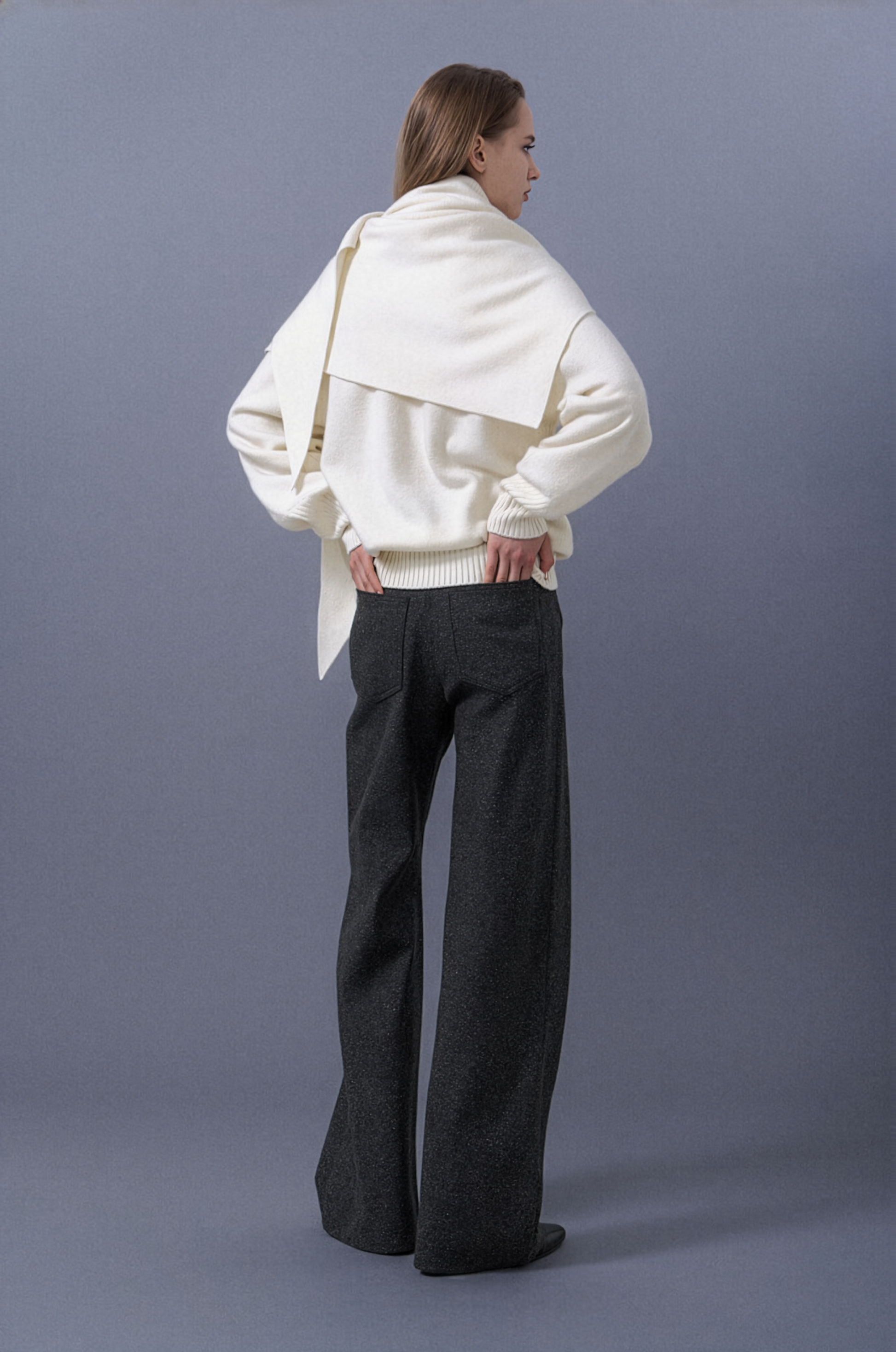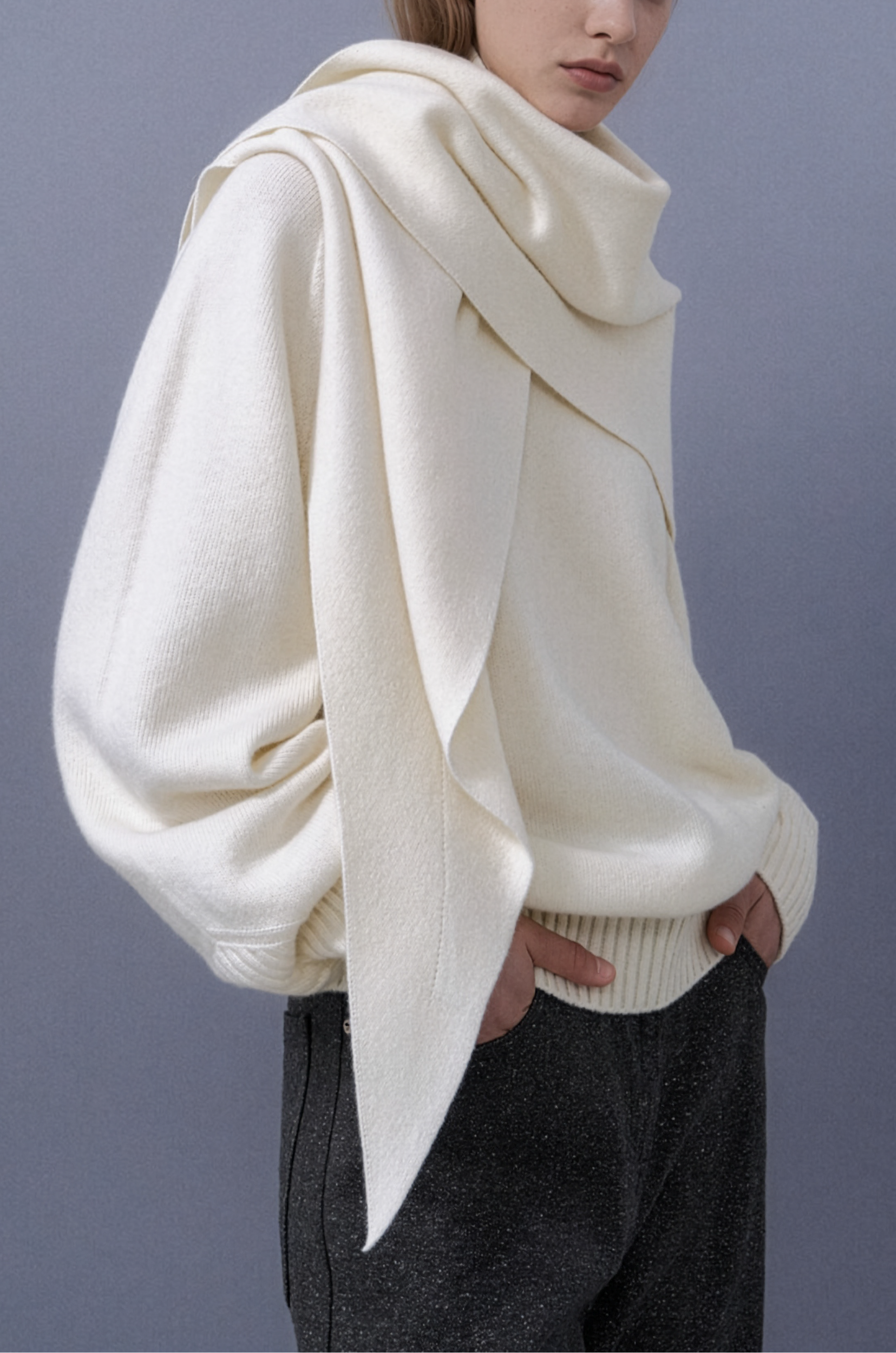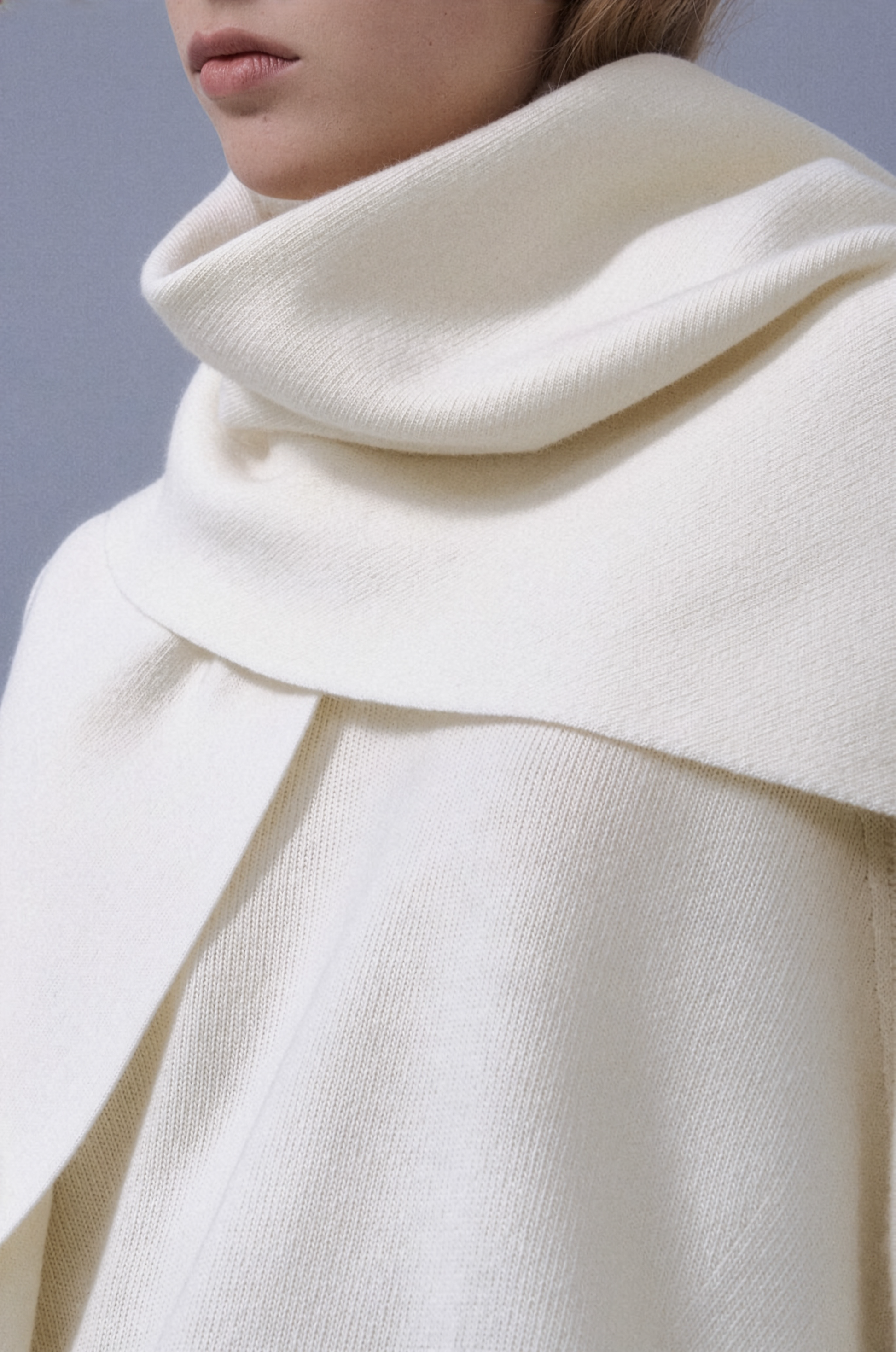This whole-garment turtle neck knit top features a seamless, high-neck design with long sleeves for a sleek and comfortable fit. It comes with a matching knit scarf in the same material, allowing for versatile styling options. The minimalist set offers both warmth and elegance, ideal for layered winter looks.