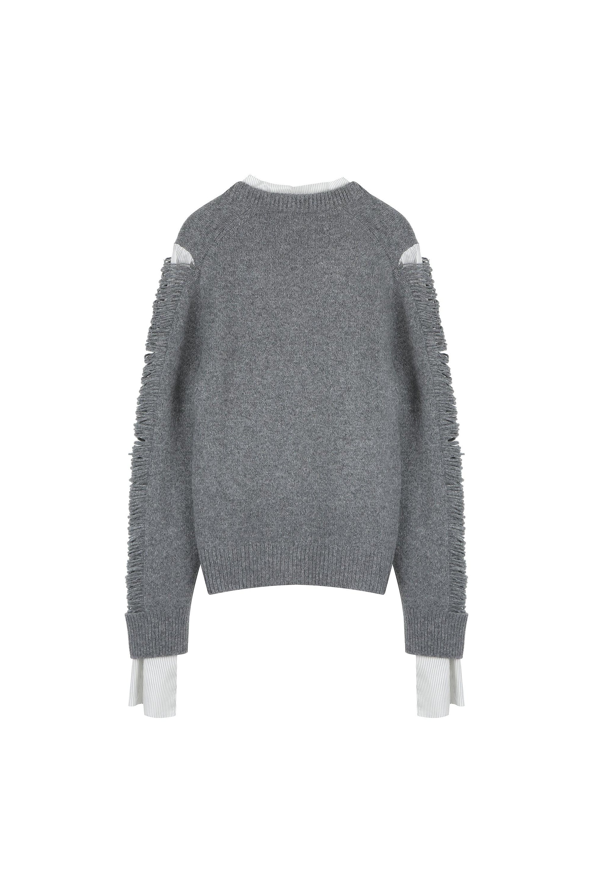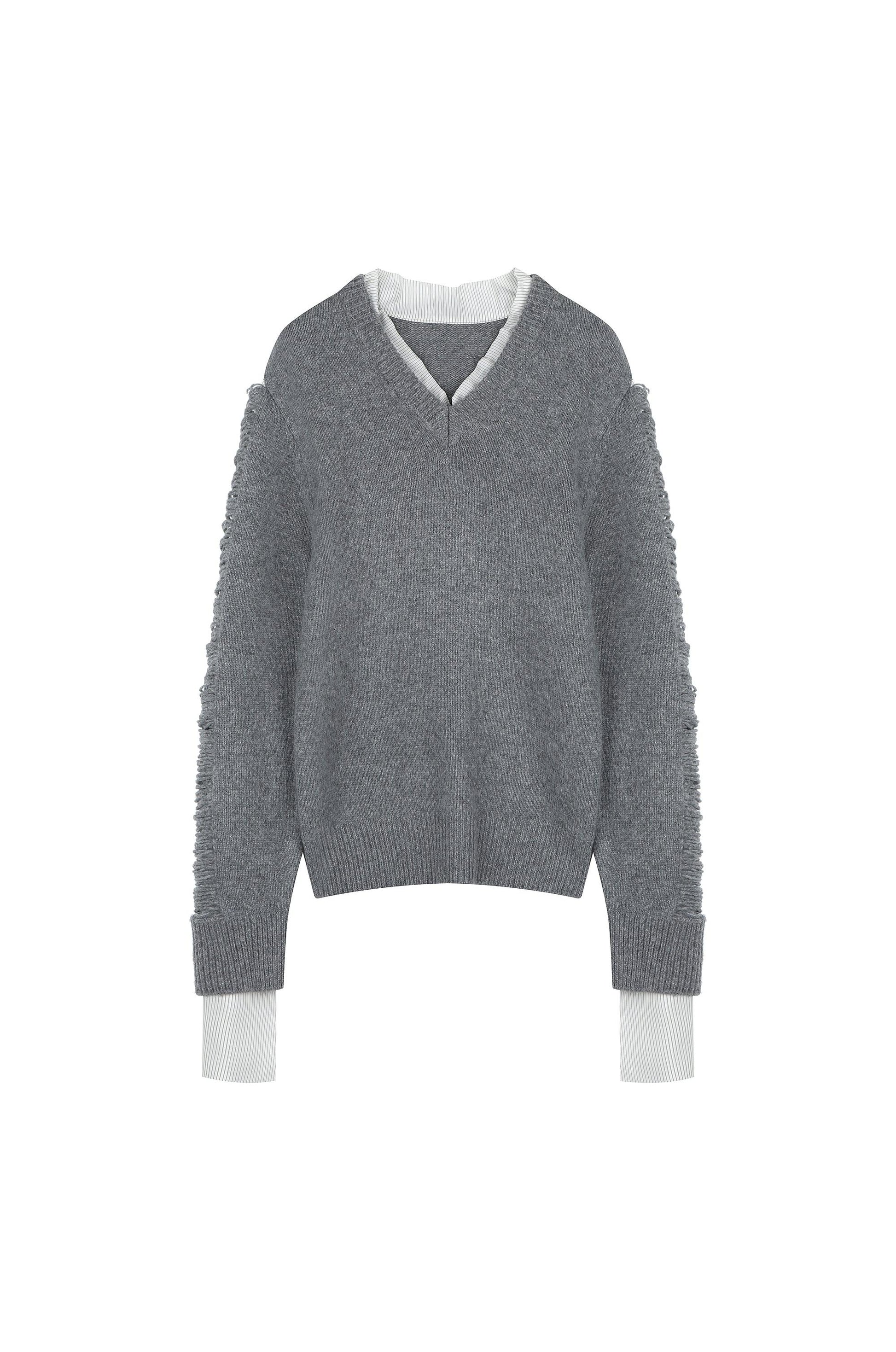 The Striped Cut-Out Knit Top features a V-neckline with layered contrast fabric along the neckline and sleeves for a unique, elevated look. Cut-out details at the sleeves add a subtle edge, while the striped pattern keeps it classic. Designed to pair perfectly with the matching skirt, this top balances modern design with coordinated styling.