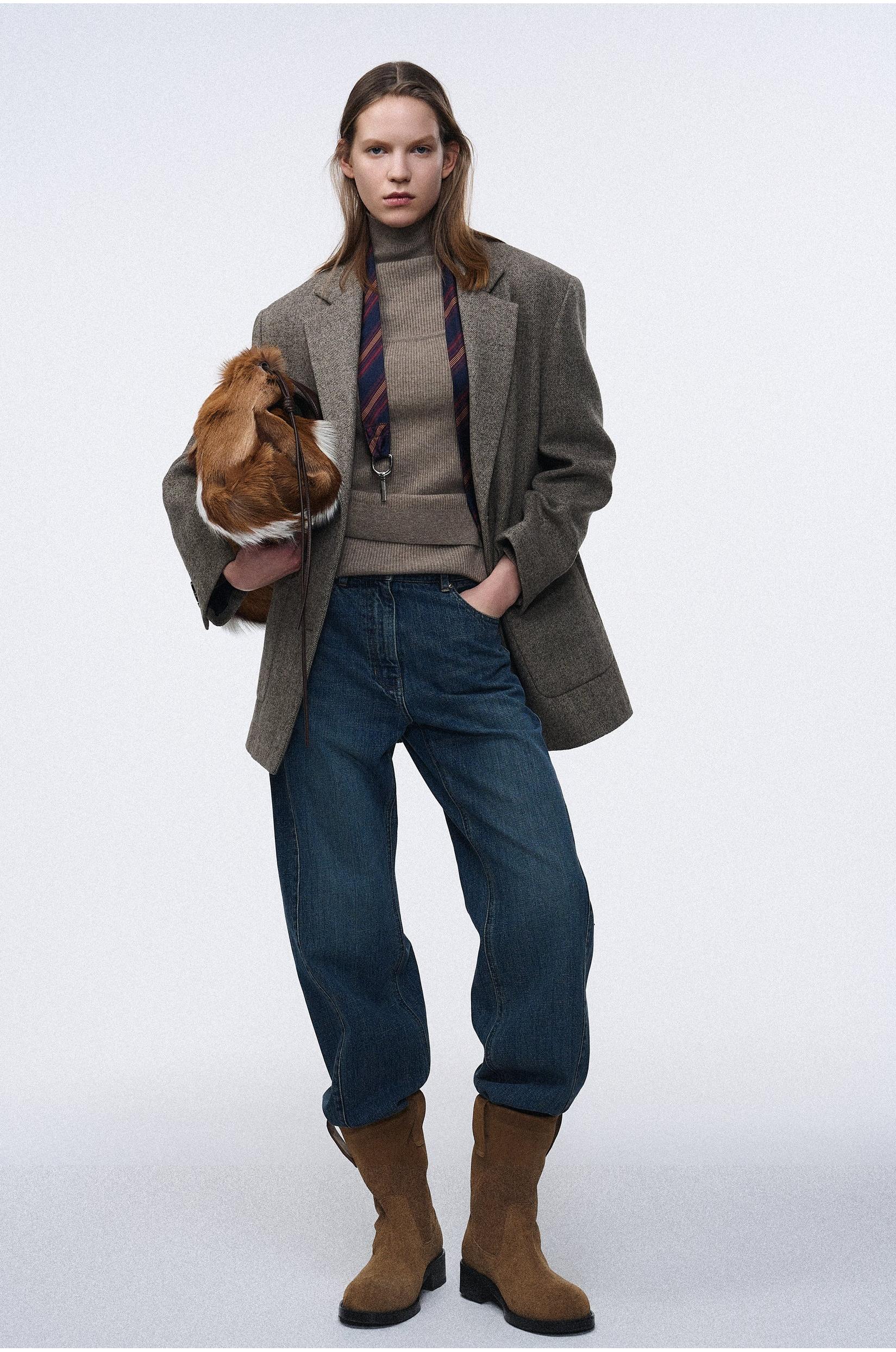 Crafted from a refined blend of 85% Cupra and 15% Polyester, these denim pants offer a soft, fluid feel with a subtle sheen—bringing an elevated edge to everyday dressing. The silhouette is relaxed through the top and gently tapers toward the hem, enhanced by carefully placed darts and a twist seam along each leg for a sculpted, three-dimensional effect. Finished with a classic 5-pocket construction and a leather patch at the back waist, this pair blends modern form with refined texture.