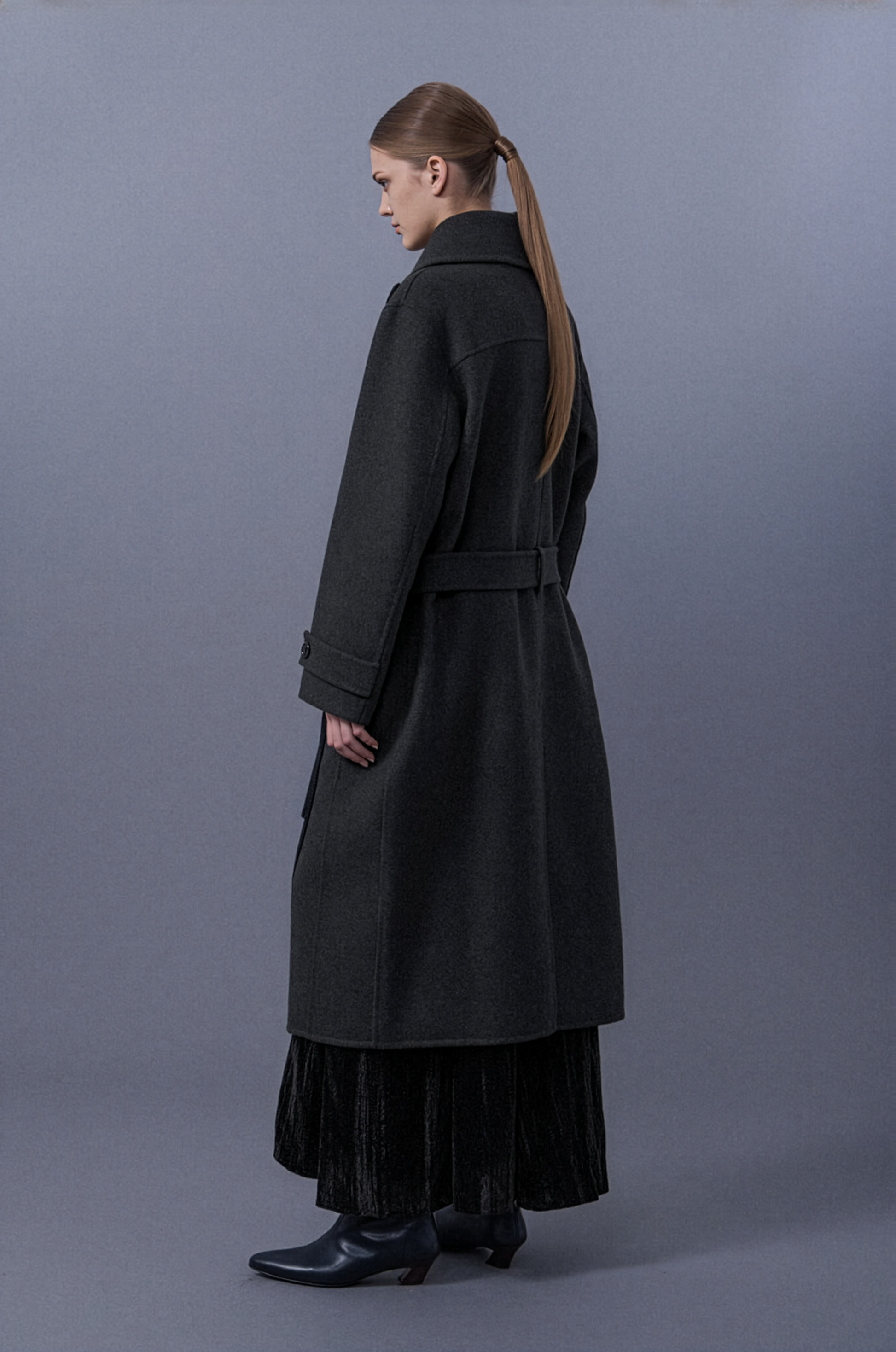 A timeless outer layer with graceful movement. The Fluid Lapel Double Coat is designed with a relaxed, flowing silhouette that drapes effortlessly over the body. Crafted from a soft, mid-weight fabric, it features wide, fluid lapels and a longline cut for a sophisticated look. The tie belt cinches the waist to create shape, or can be worn open for an easy, laid-back feel. Fully lined for comfort and designed for layering, this coat brings elegance and versatility to your cold-weather wardrobe.