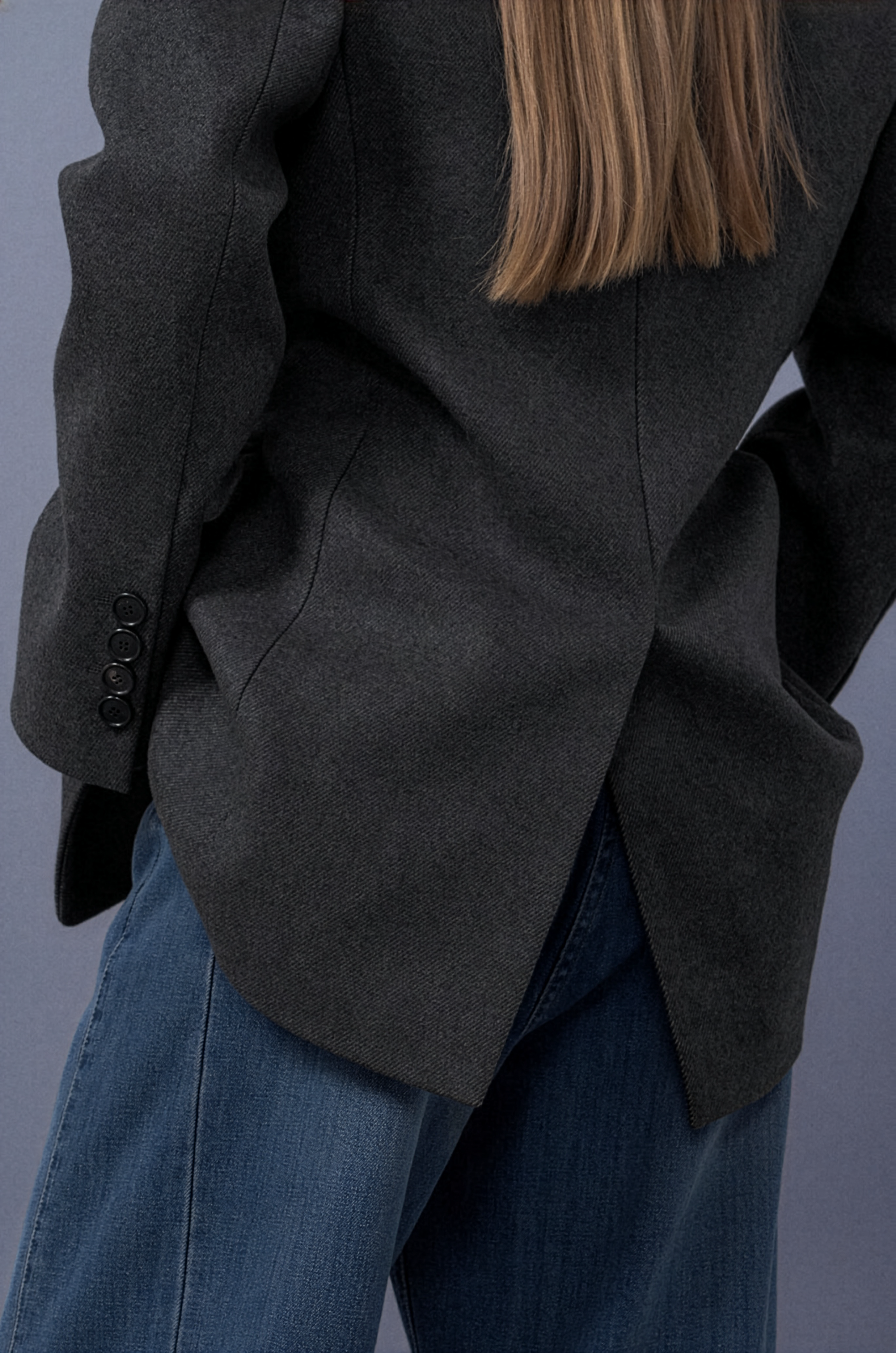 This jacket is crafted from 78% wool and features a classic double-breasted design. It offers a structured silhouette that emphasizes sharp lines and a refined shape. A timeless piece that combines elegance with modern tailoring, reflecting the signature fit unique to SYSTEM.