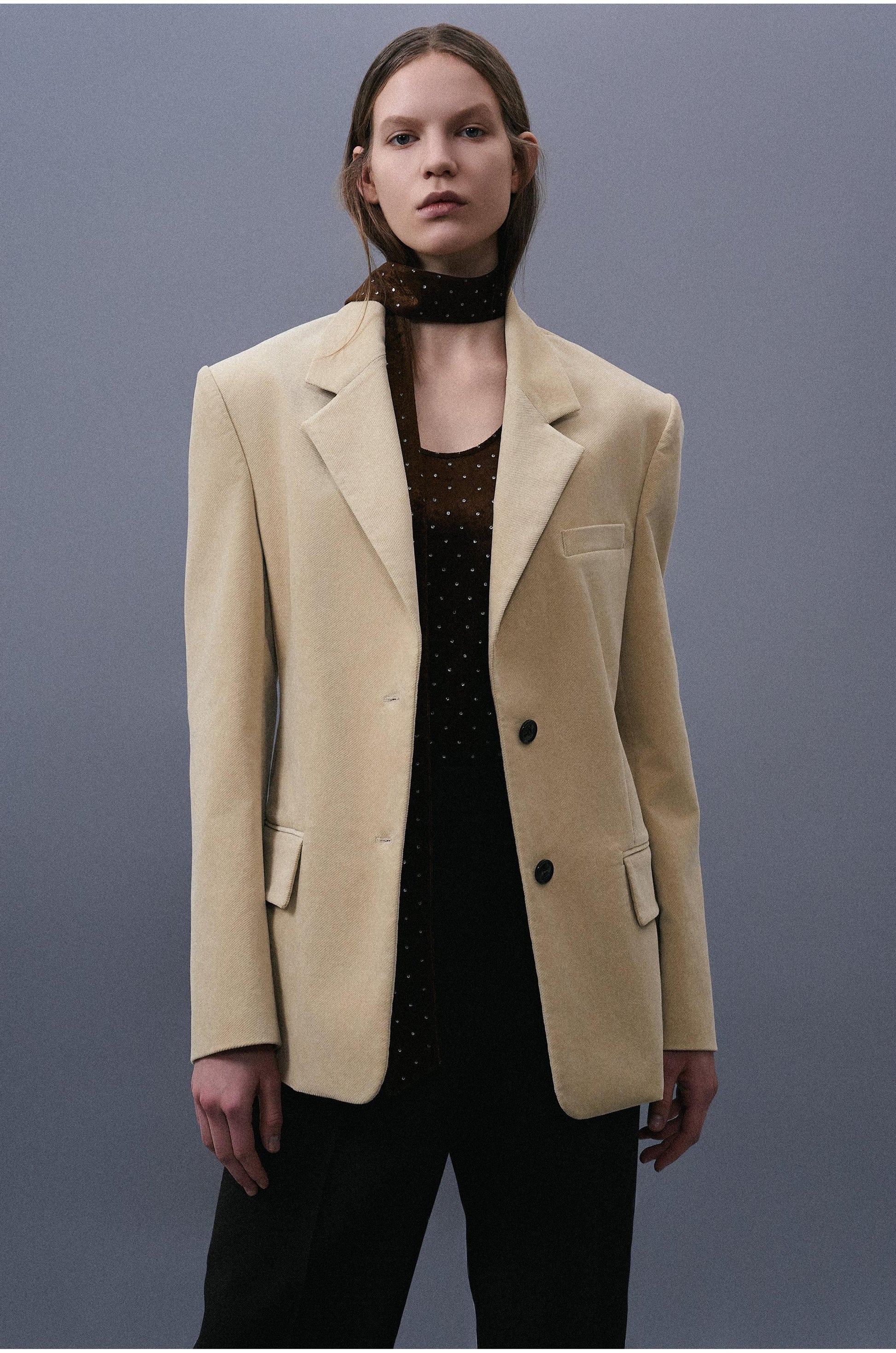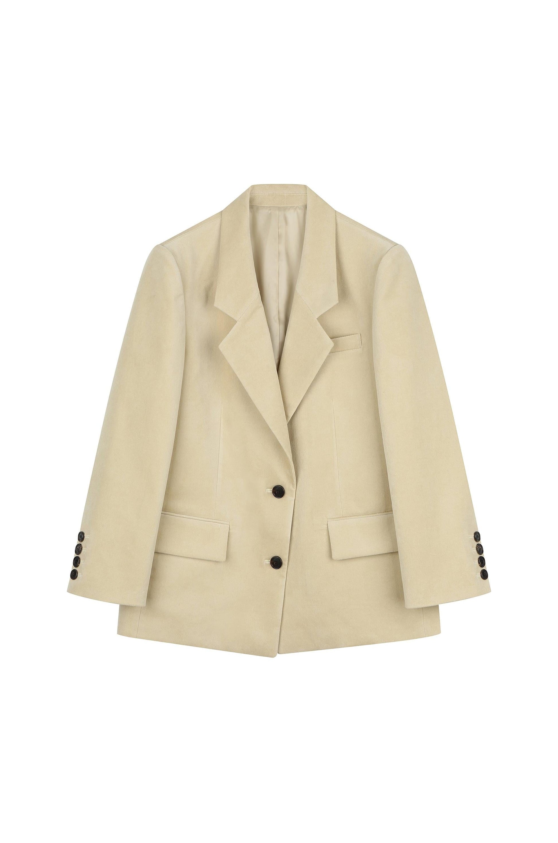 Crafted in a soft vanilla-toned velvet with a blend of 78% cotton and 20% viscose, this single-breasted jacket features structured shoulders and a clean, timeless silhouette. While it maintains the foundation of a classic single jacket, its refined tailoring and distinctive fit reflect the subtle sophistication unique to SYSTEM.
