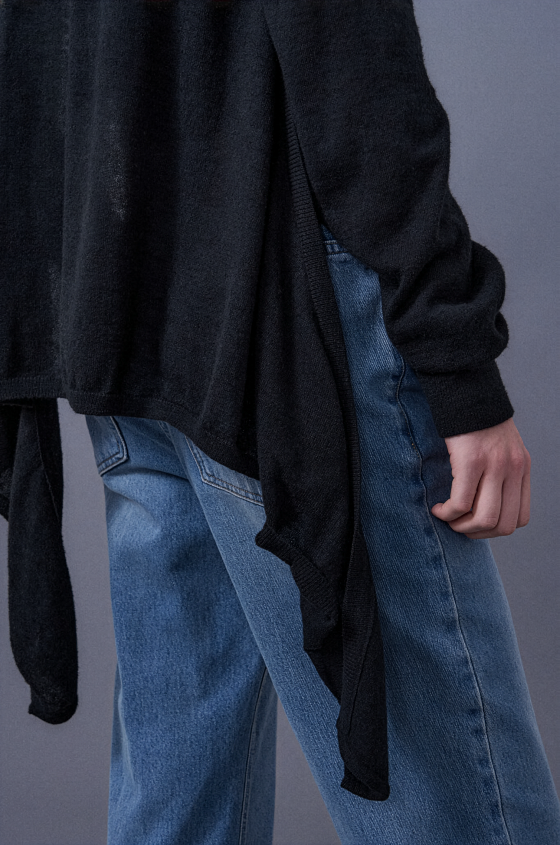 This lightweight long-sleeve knit top is crafted from a soft blend of 15% wool and 5% alpaca, offering warmth with a delicate, airy feel. Featuring a classic round neckline, it includes a tie detail at the waist, allowing for versatile styling and adjustable fit. The slim, refined silhouette and sheer fabric create a polished, contemporary look, perfect for layering or wearing on its own.