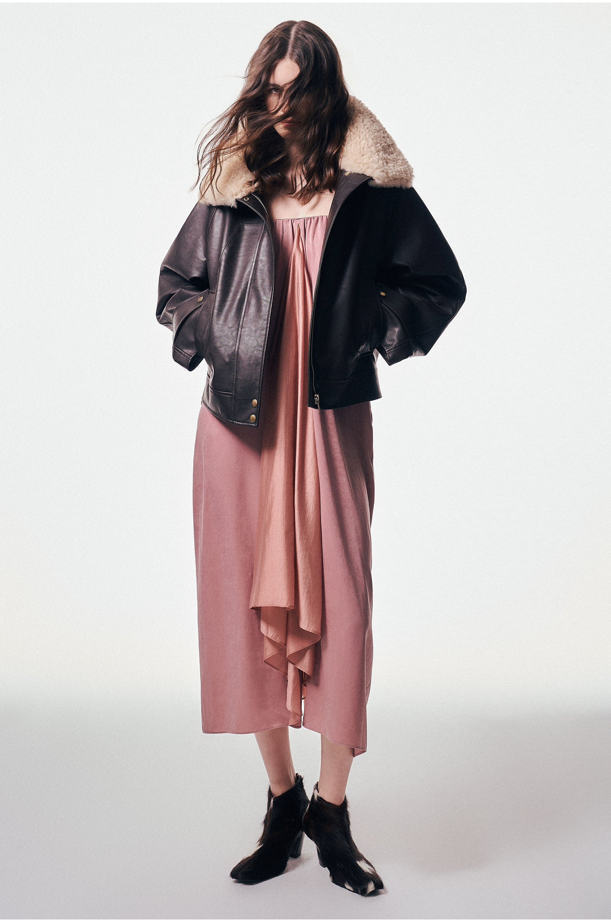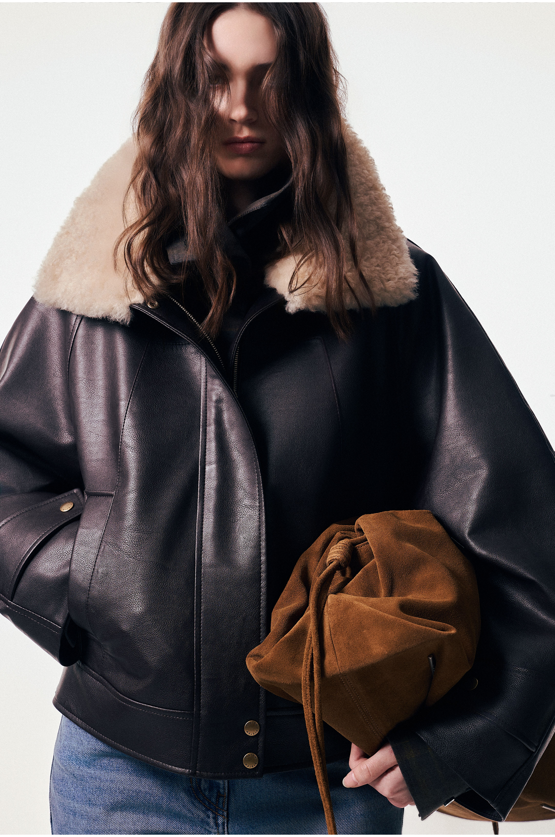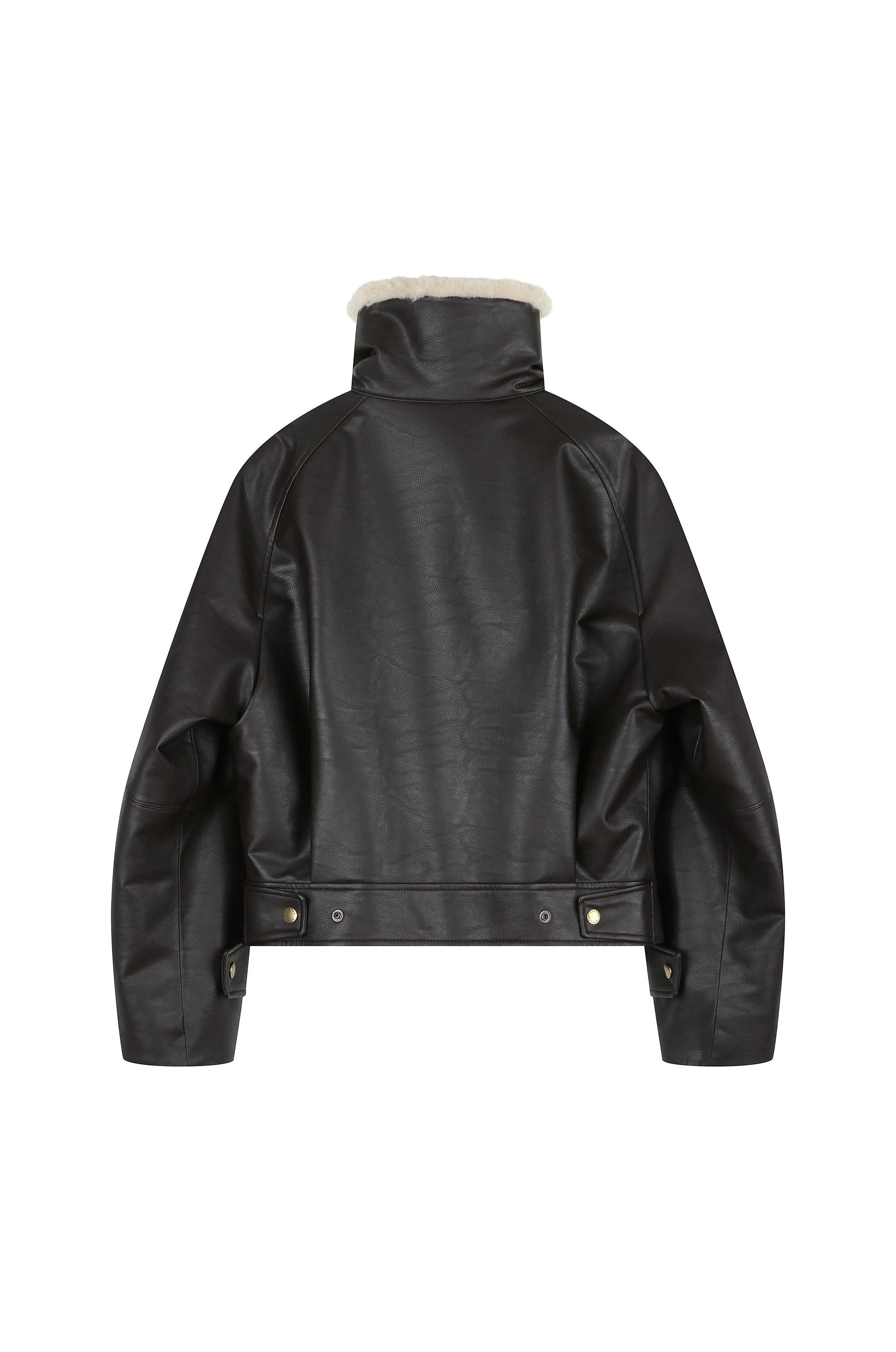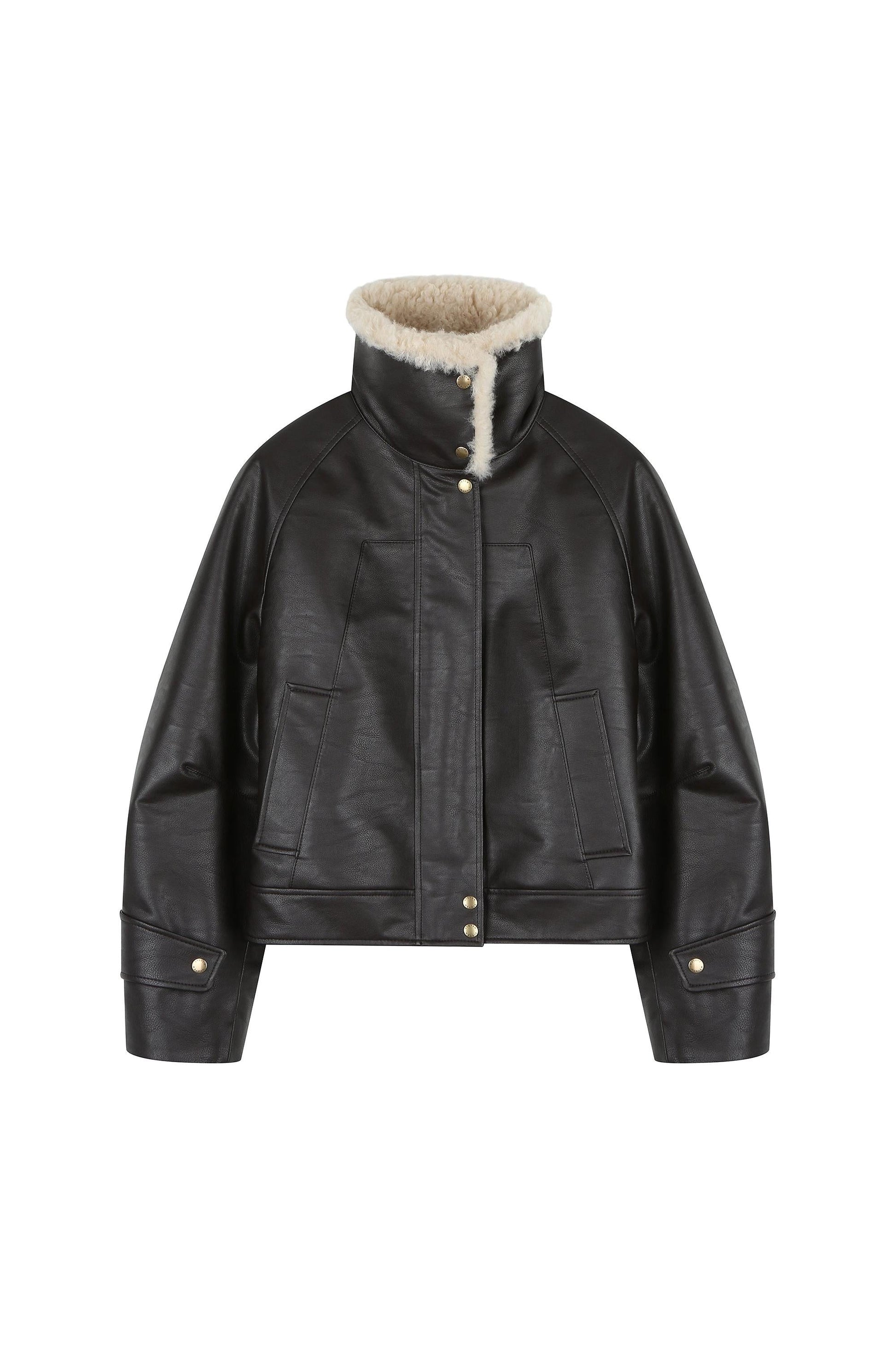 This short mustang jacket is crafted from synthetic leather and combines edgy style with practical design. The high neckline can be fully fastened with snap buttons for extra coverage, while the front features both a zipper and snap-button closure. Loose-fitting sleeves add a relaxed vibe, accented with decorative button strips along the cuffs. Perfect for layering over casual outfits, this jacket balances modern aesthetics with functional details.