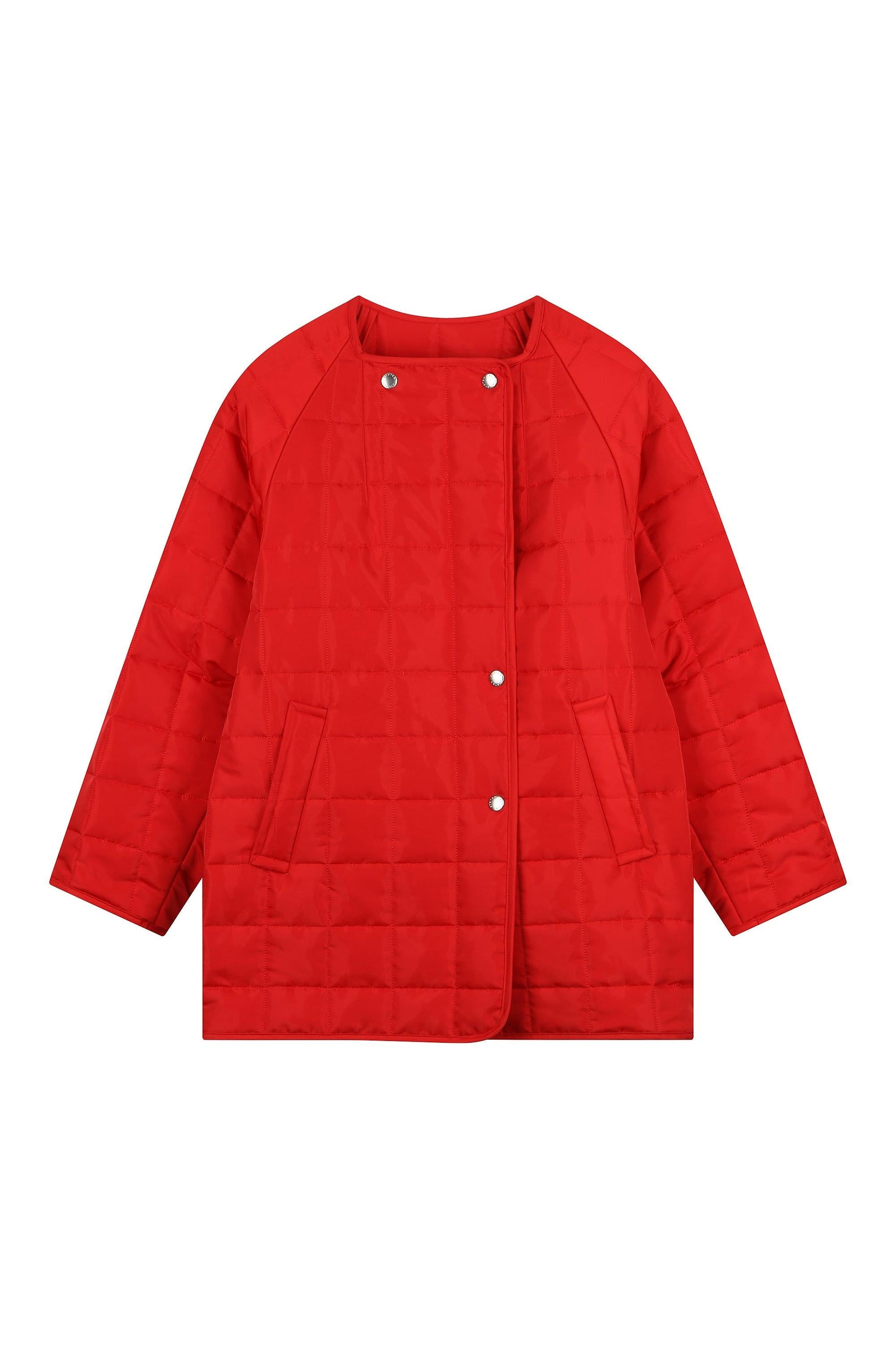 This coat features a clean square neckline with two snap buttons for a polished finish. The quilted design adds subtle texture while providing lightweight warmth, making it perfect for transitional seasons. Its streamlined silhouette allows for effortless layering over everyday outfits, combining comfort and understated style.