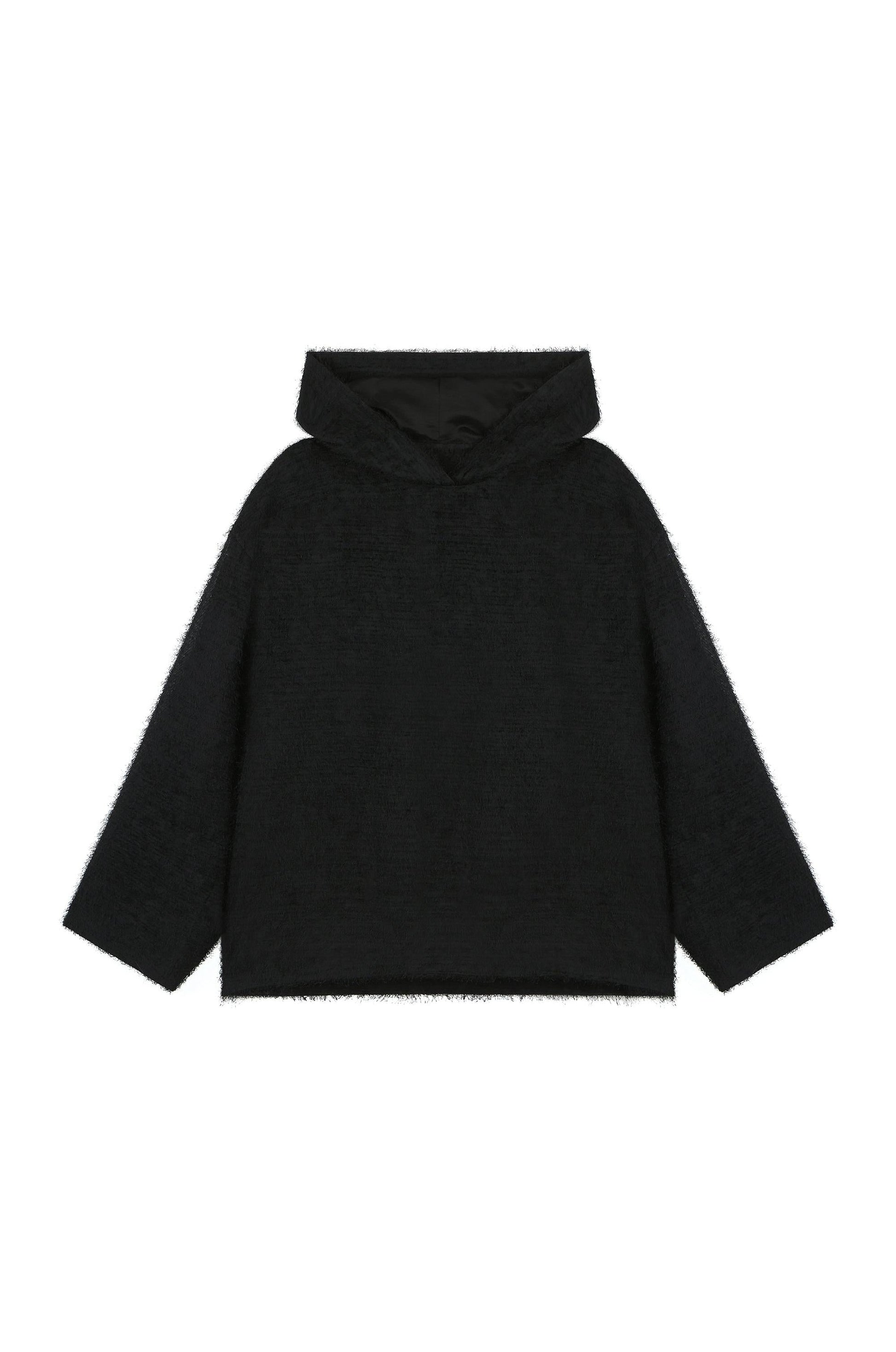 This hoodie features a soft, curly-textured fabric for a cozy, tactile feel. Its relaxed, loose fit and roomy hood make it perfect for comfortable everyday wear, layering, or lounging. A casual yet stylish piece, it brings warmth and effortless charm to any outfit.