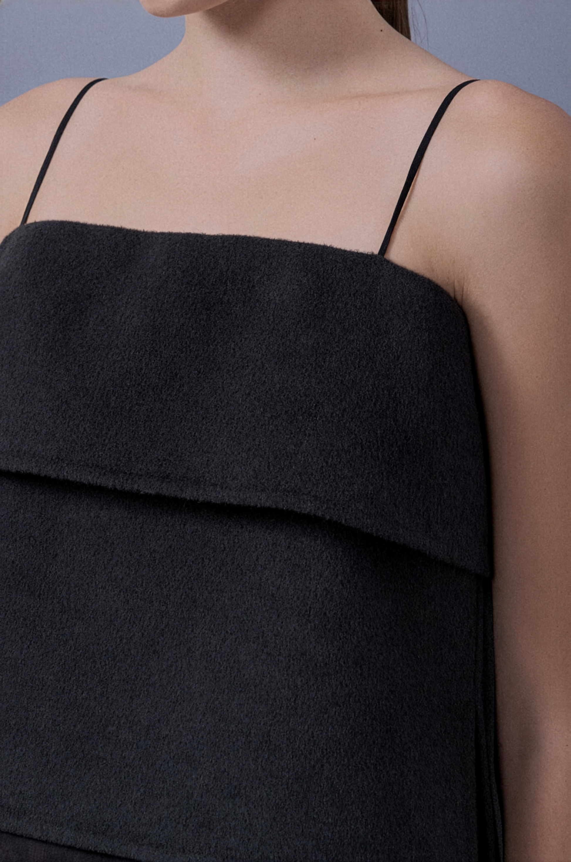 This elegant tube top is crafted from a luxurious wool-cashmere blend for a soft, warm feel. Featuring delicate straps, it is enhanced with a layered chiffon detail that drapes gracefully on one side, creating a subtle, flowing silhouette. The combination of textures and the layered design adds depth and sophistication, making it a versatile piece for both casual and refined looks.