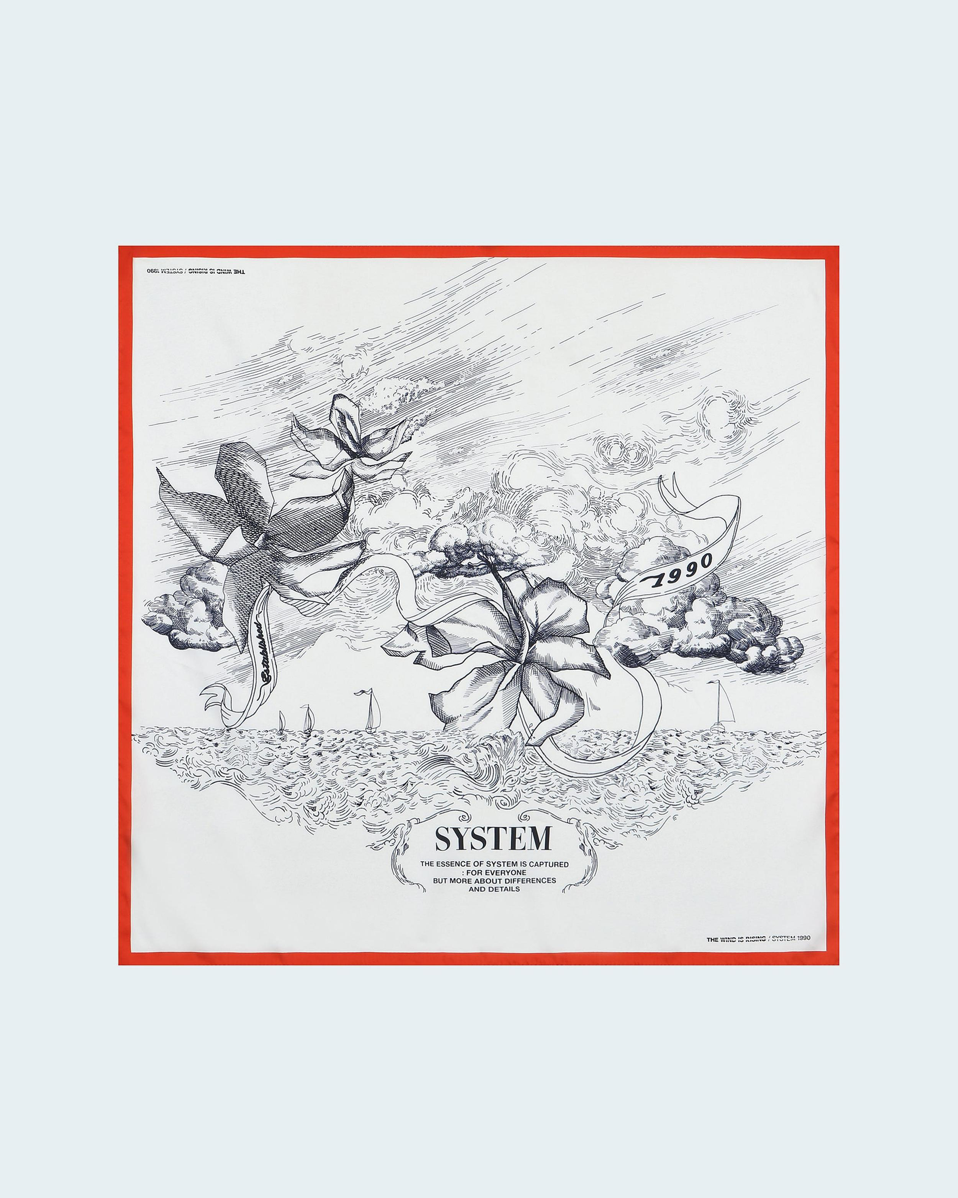 A silk scarf adorned with delicate pen-drawn artwork, creating a refined and artistic mood. The smooth, lightweight silk drapes fluidly, adding an elegant accent to both casual and polished styling.