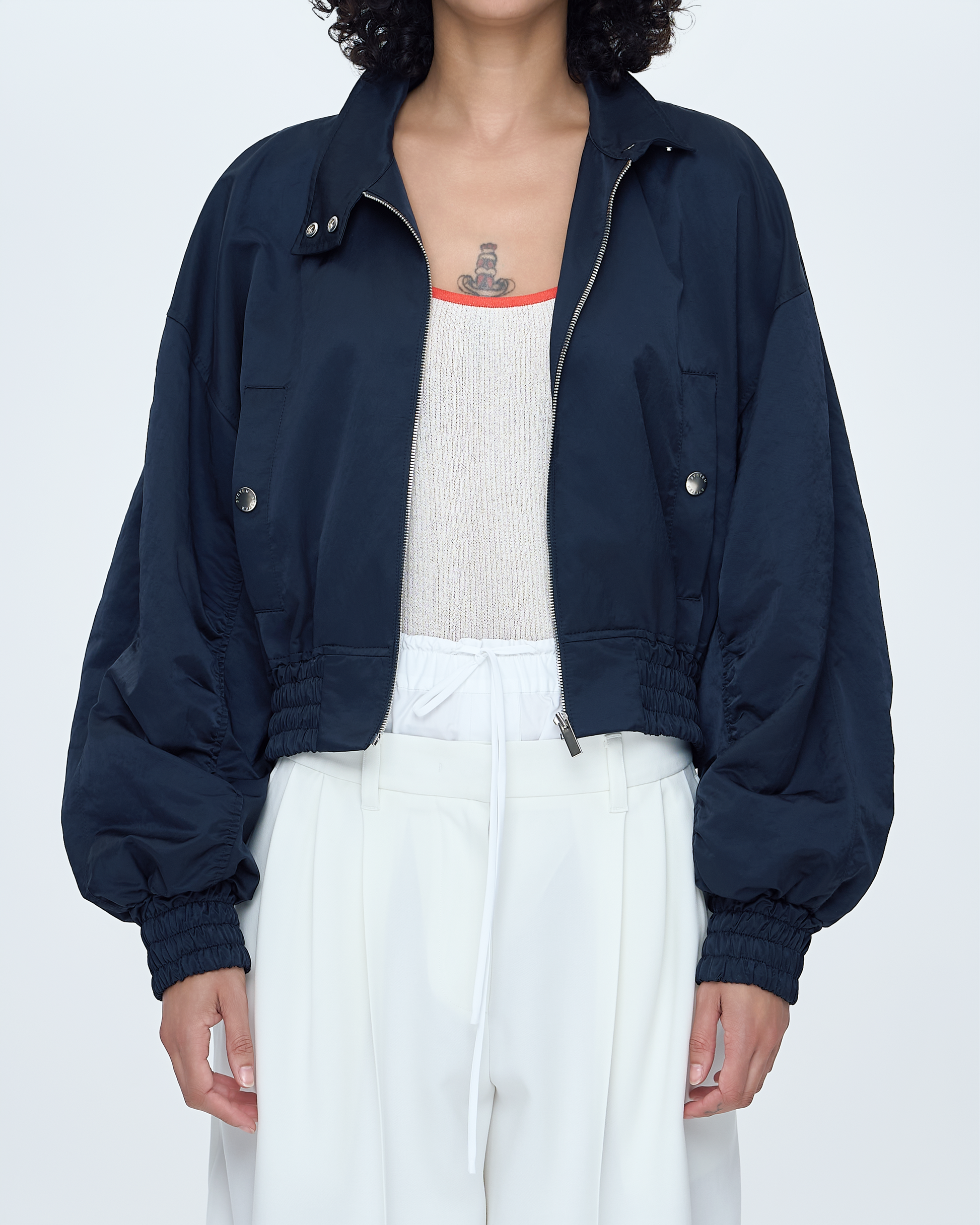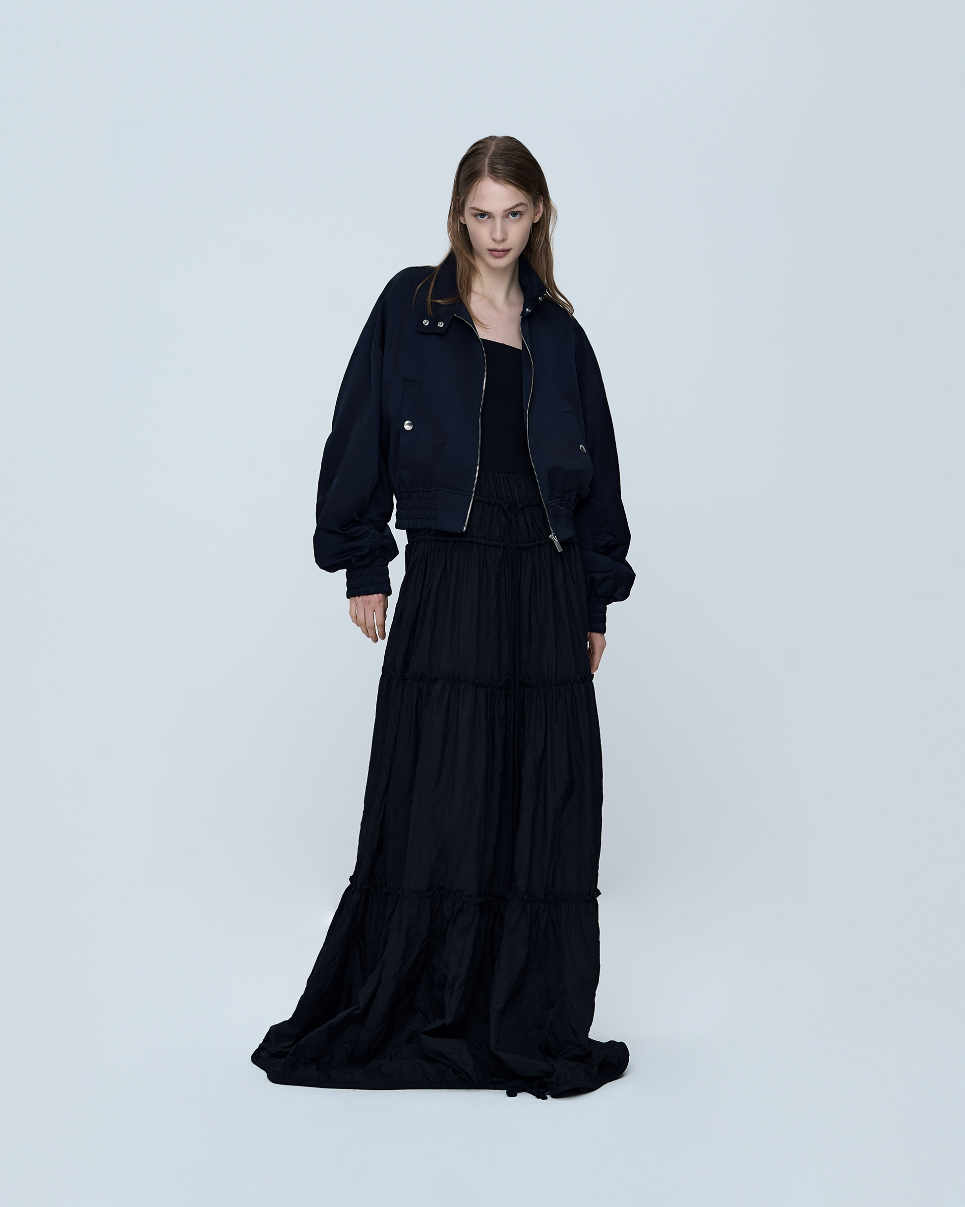 This zip-up jumper features a metallic finish and a stand-up China collar, blending modern shine with a sleek, structured silhouette. The lightweight fabric drapes smoothly while the zip-up design allows easy layering and versatile styling.