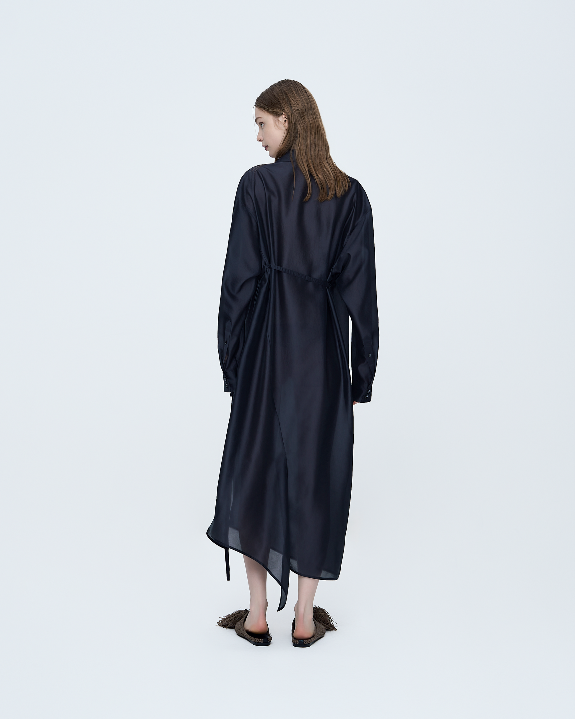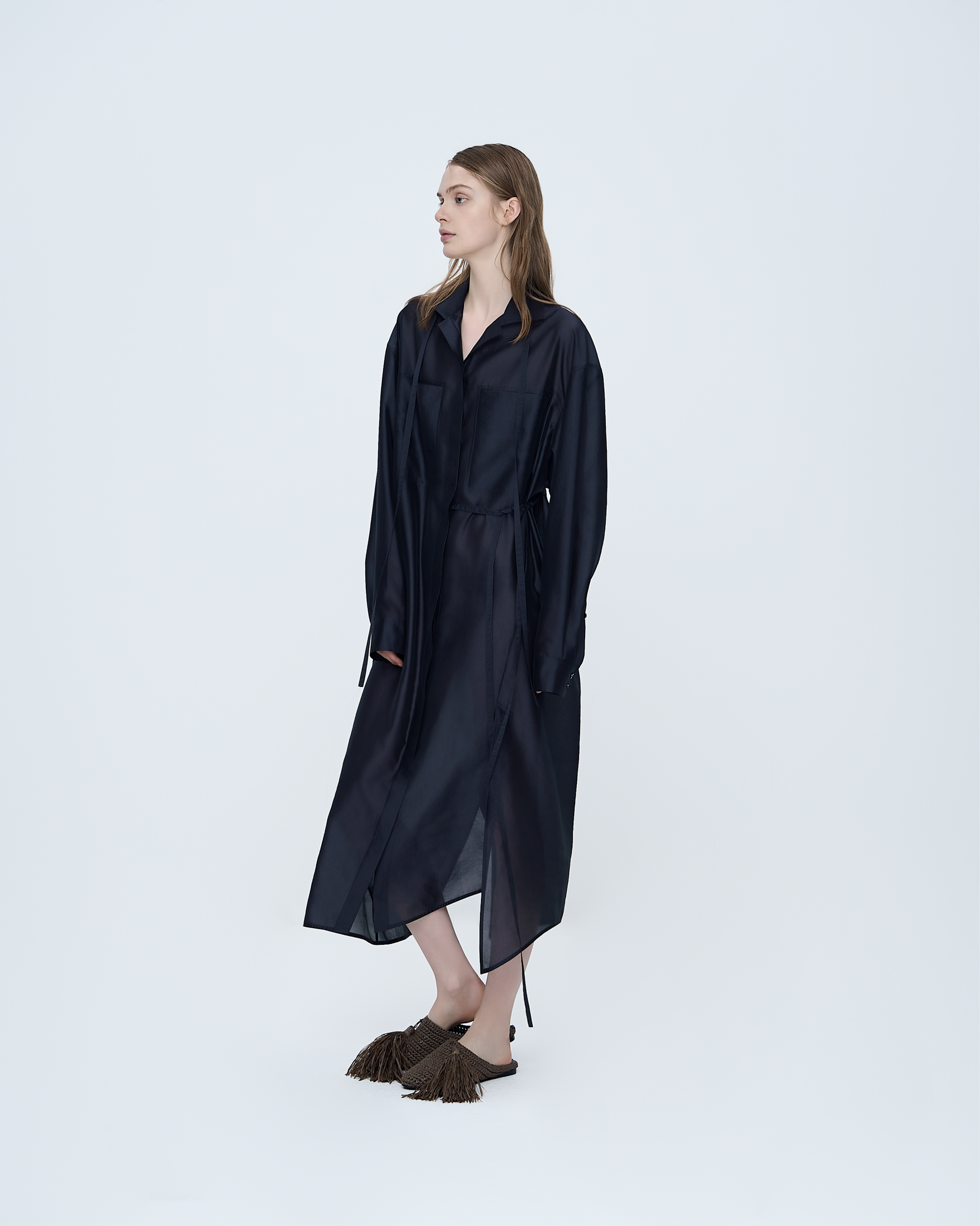 Crafted from a slightly glossy, semi-sheer fabric, this long shirt dress features a tie waist that allows you to define the silhouette. The lightweight material drapes fluidly, creating an elegant, feminine shape while maintaining a relaxed, effortless look