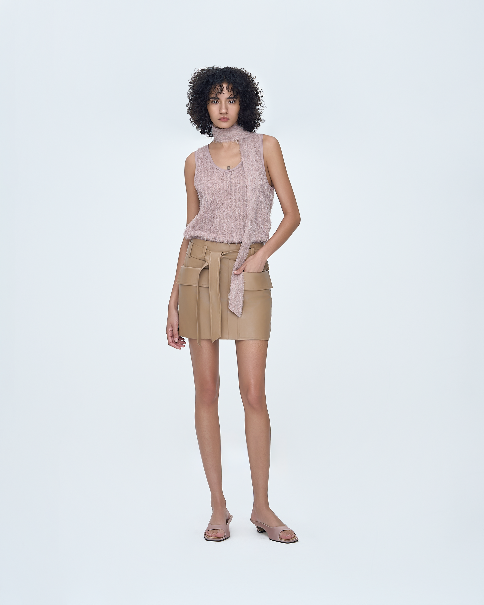 Elevate your summer wardrobe with a boucle sleeveless top defined by its delicate, feather-like texture and cloud-soft touch. A matching neck-tie detail adds a sophisticated accent to the plush, fuzzy fabric, creating a look that is both tactile and feminine.