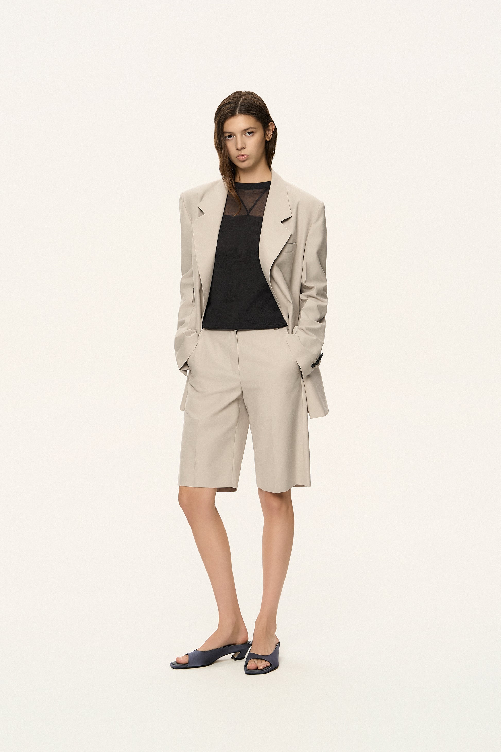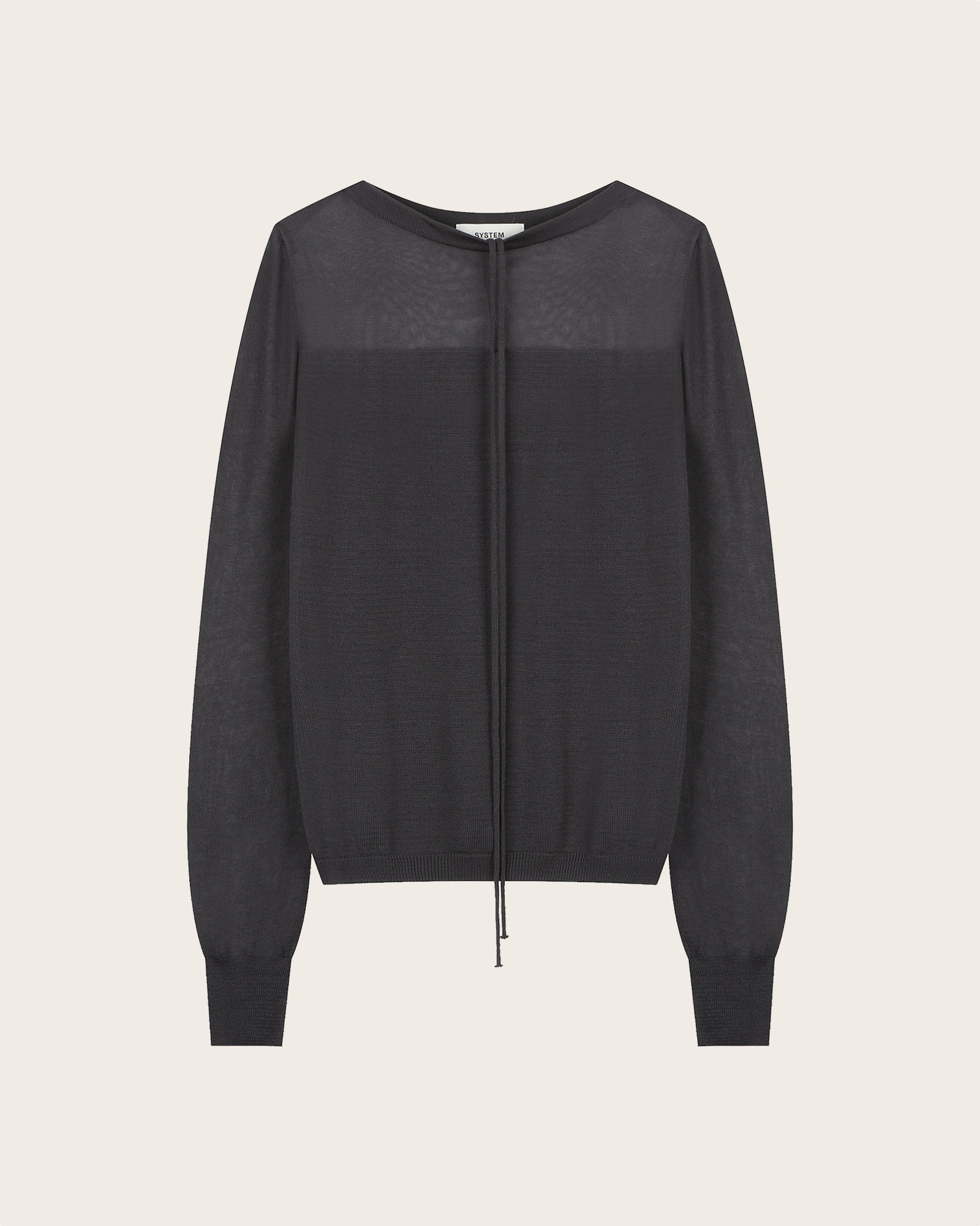 A lightweight knit top with a subtle sheer finish. The boat neckline gently frames the neck, while sheer texture blocks on the upper body and sleeves add a delicate touch. A ribbon strap inside the upper front panel can be tied at the back for a soft point of interest, creating a natural silhouette in motion. Ribbed finishes at the neckline, cuffs, and hem provide a clean and secure fit.