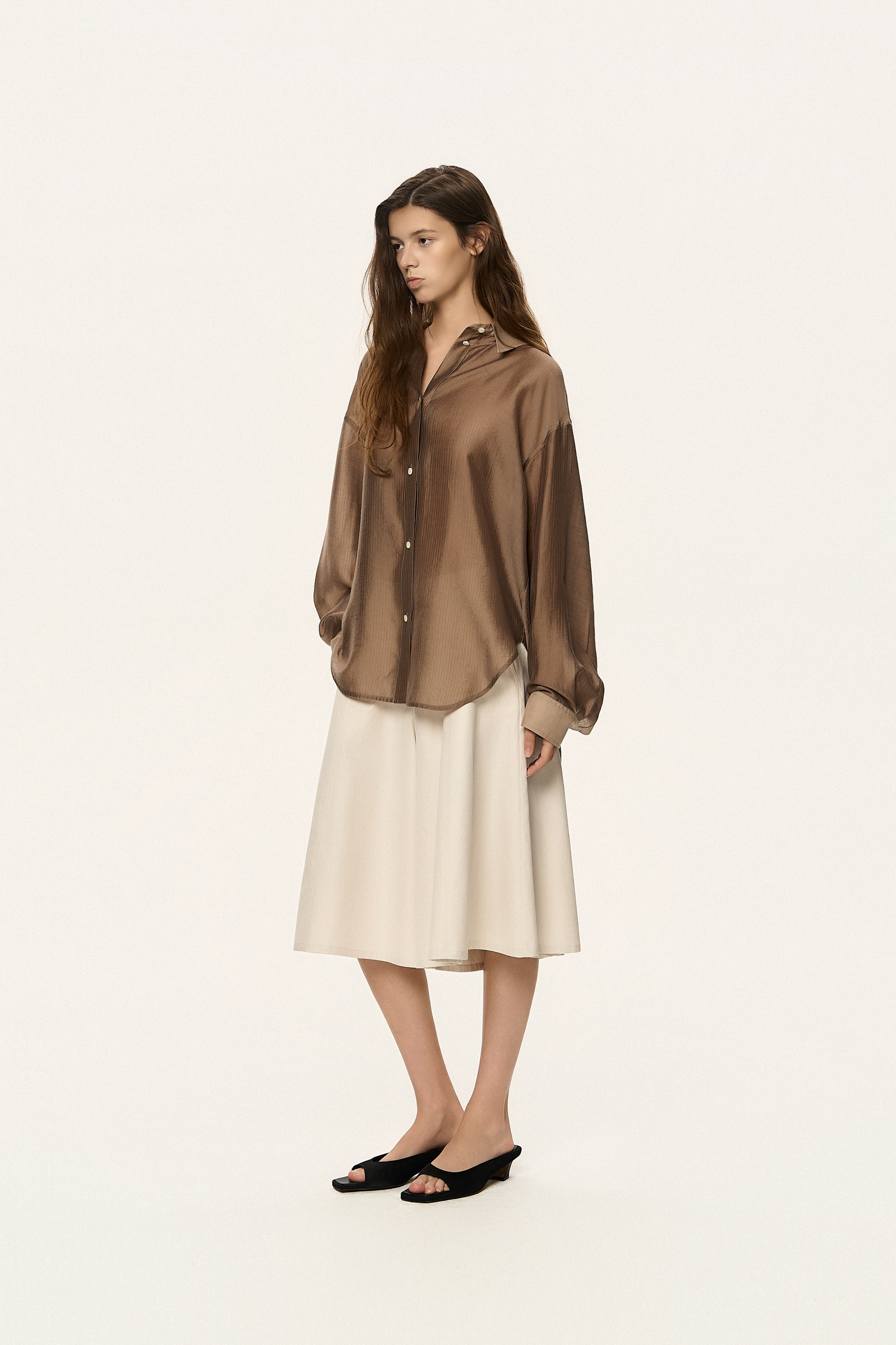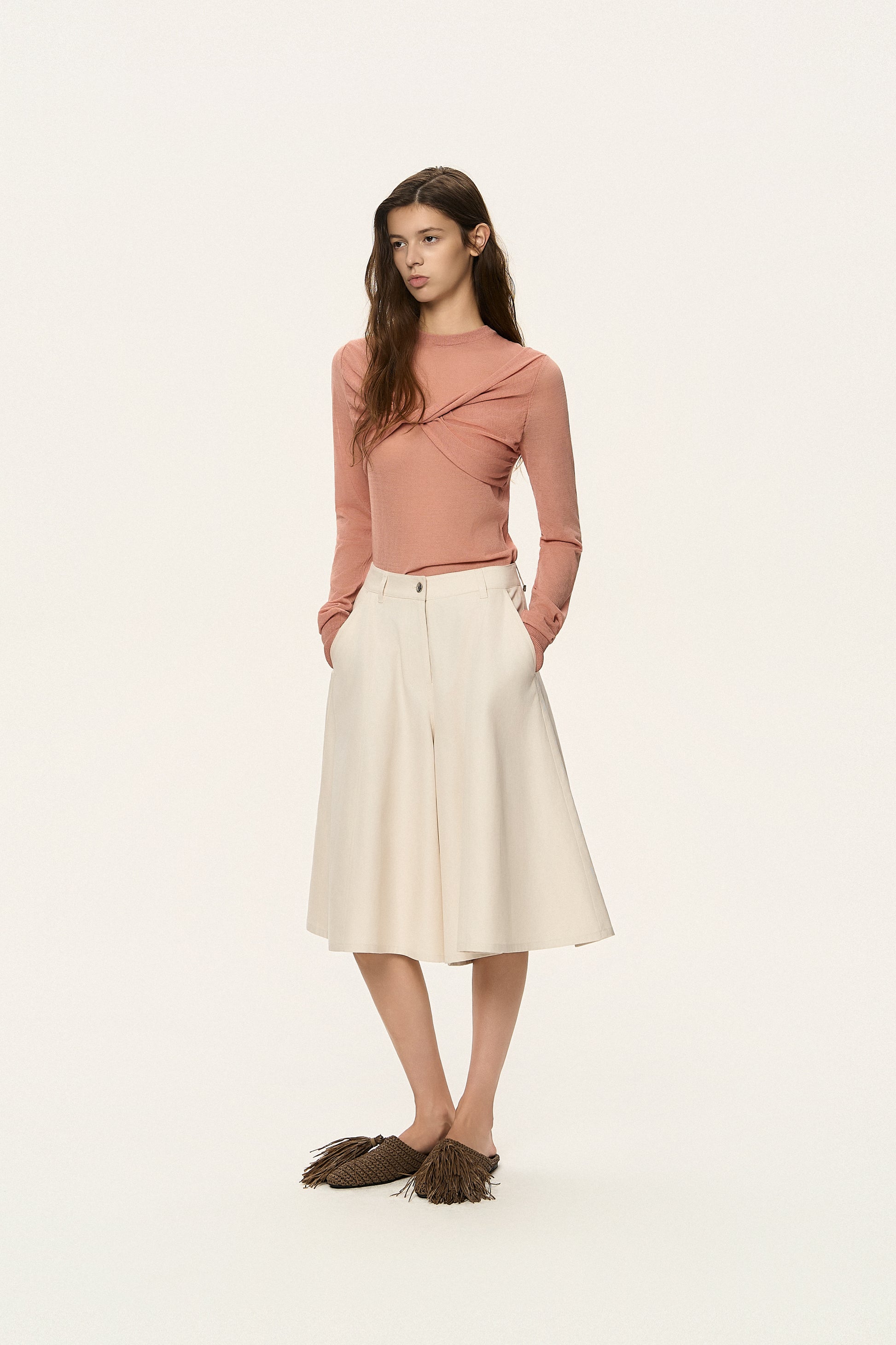 Redefine your summer wardrobe with these innovative skirt-like pants. The high-quality cotton-linen fabric ensures a crisp yet comfortable fit, ideal for warmer days. With a knee-skimming length and artistic draping, this piece offers a modern, voluminous shape that moves beautifully. It’s the ultimate hybrid of feminine flair and functional design.